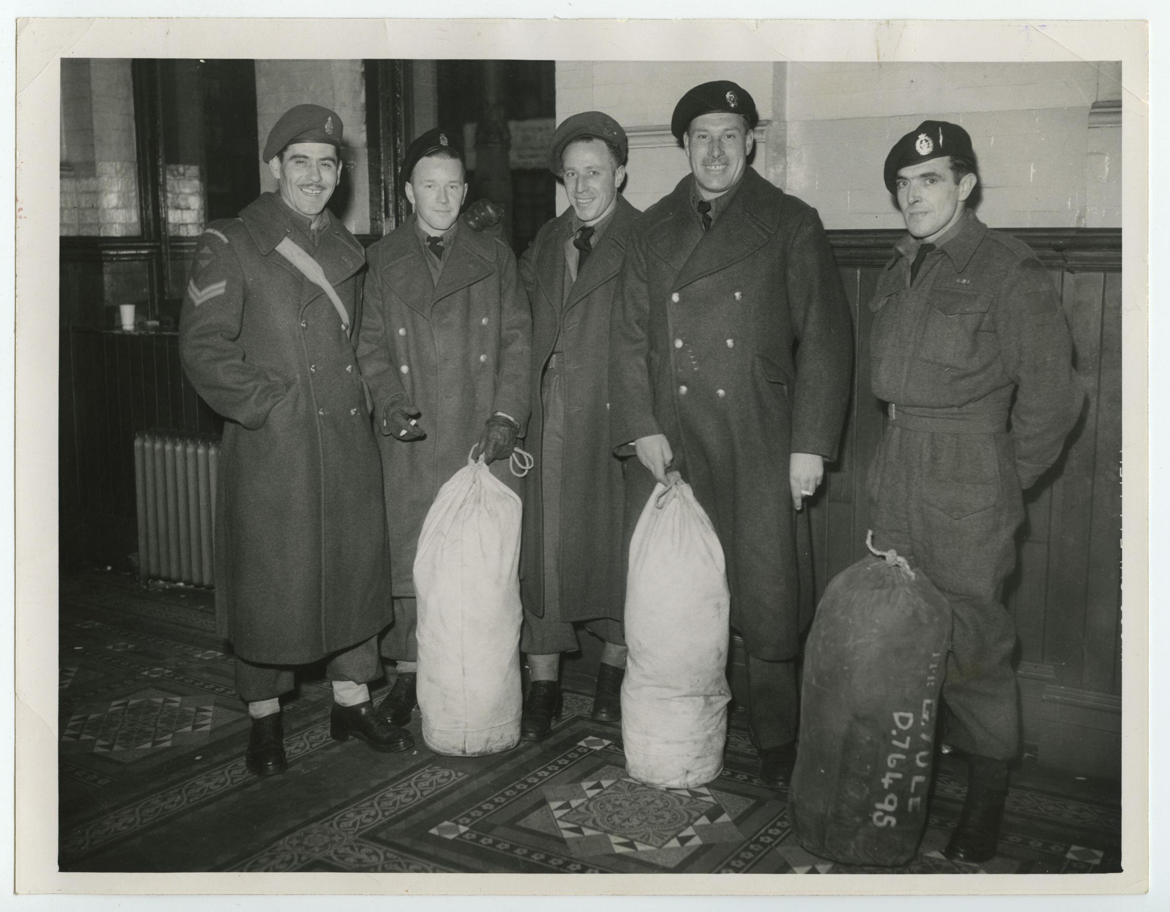 A black and white photo of five (5) soldiers back from the war. These are soldiers who went overseas as members of the Royal Montreal Regiment in 1939 and returned as members of different formations.