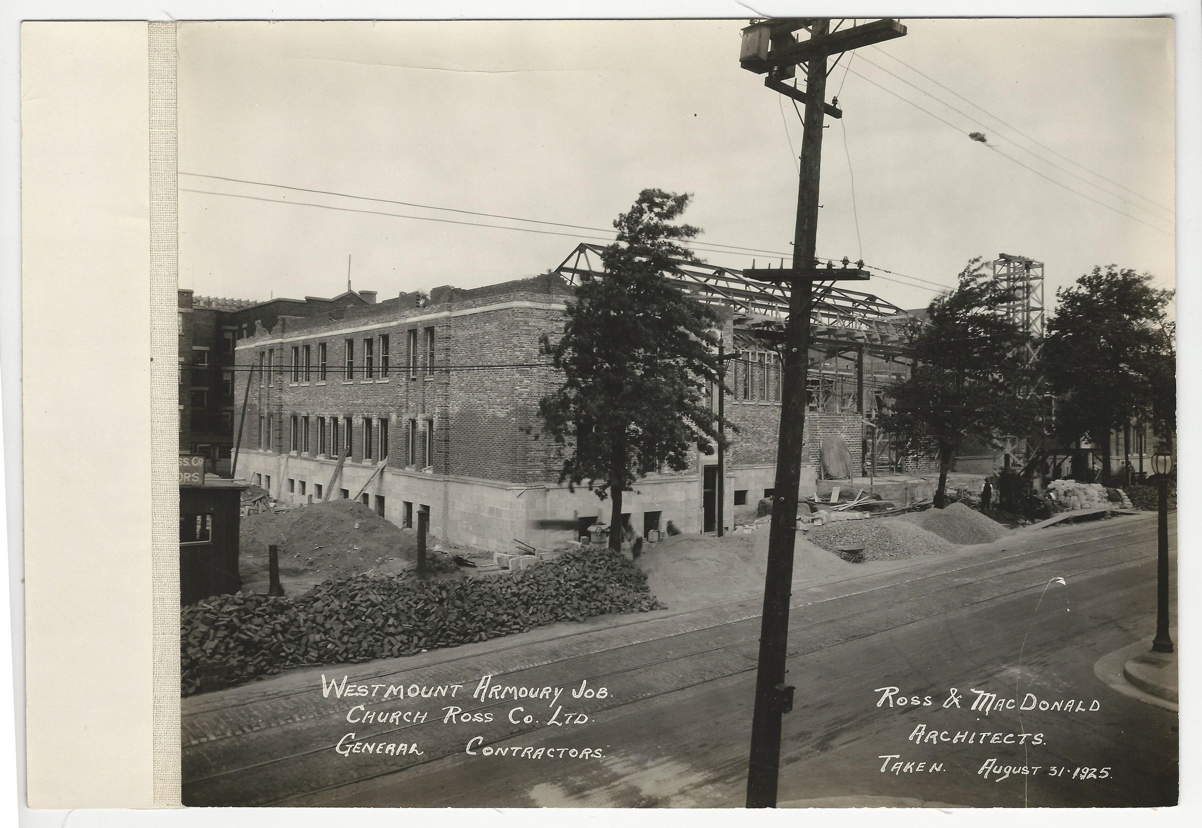 Photograph of the construction of the RMR Westmount Armoury. The roof is being framed and the walls are almost completed.Photograph Details