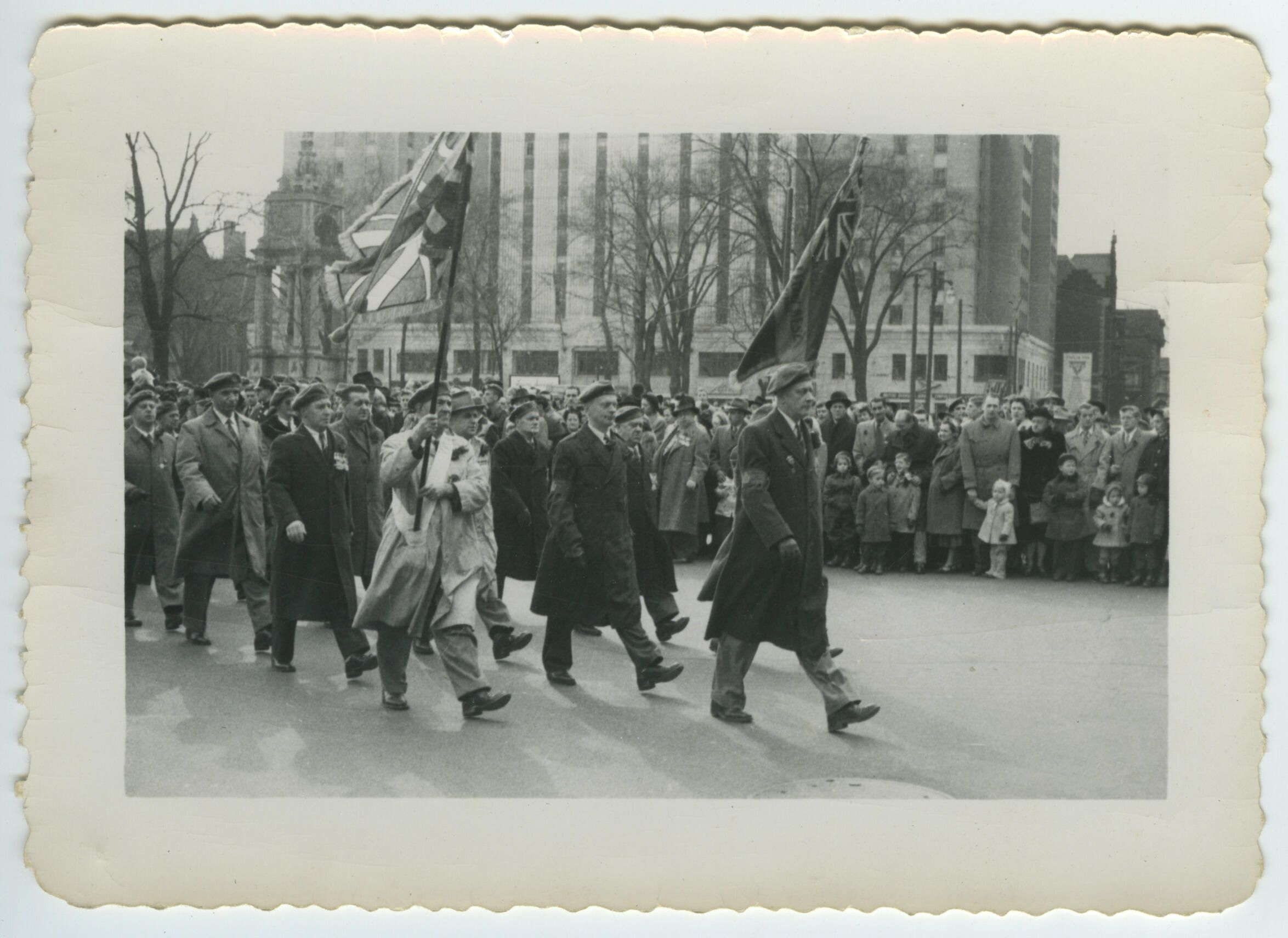 Members of The Royal Montreal Regiment Branch 14 of the Royal Canadian Legion marching at a Remembrance Day Ceremony on Dominion Square, Montreal. The old Laurentian Hotel is visible in the background.Photograph Details