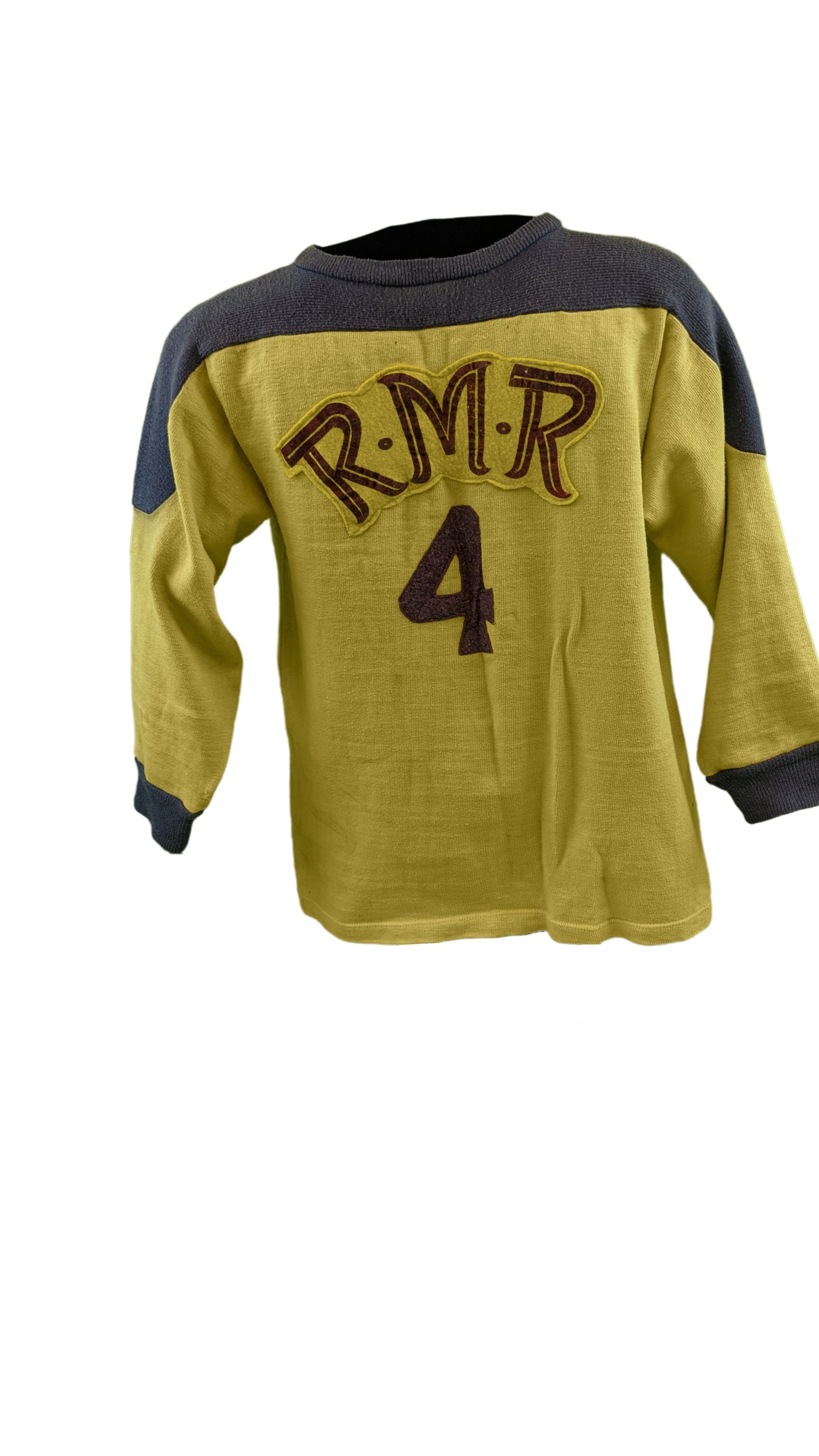 RMR Football Team jersey, Yellow, Blue and Red (RMR colours). This specific jersey was worn by Paul O'Neil in 1949. There is some blood on the front of one of the sleeves.