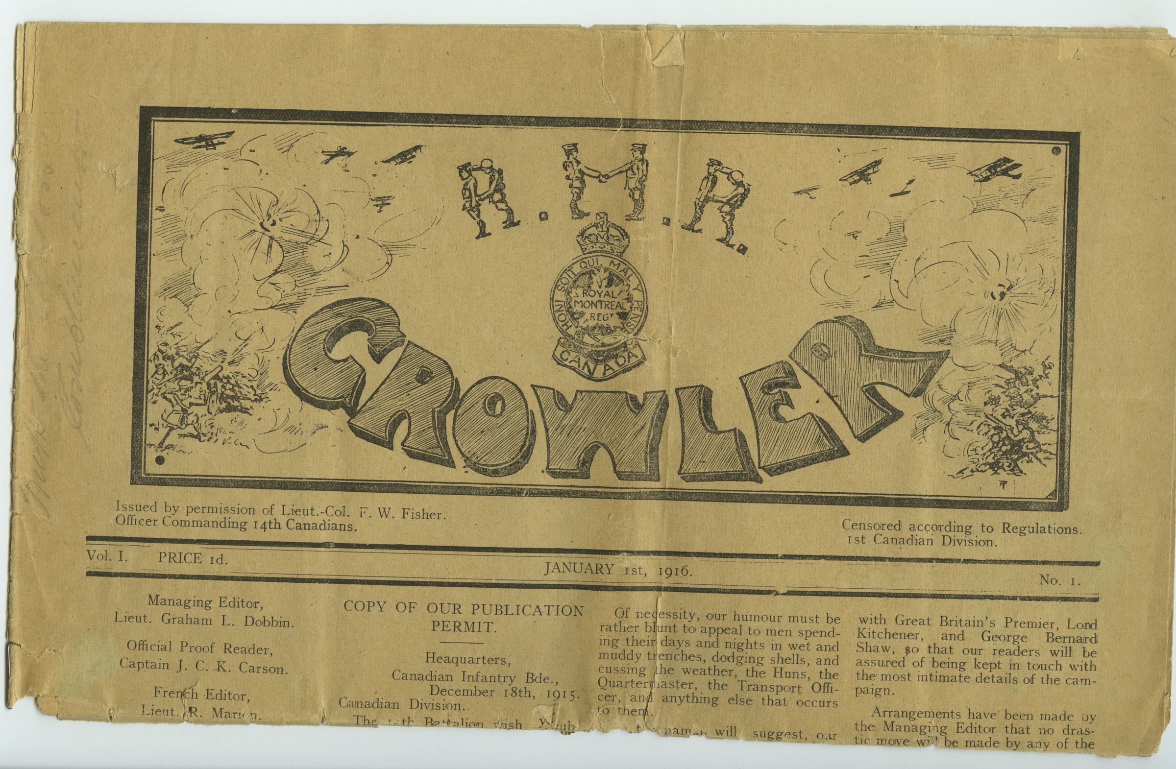 A copy of the "R.M.R. Growler" of January 1st, 1916. This news paper was produced by 14th Bn., (The Royal Montreal Regiment), and was authorized by its Commanding Officer, Lieut-Col F. W. Fisher. This was the only issue of this paper ever produced.Lexicon