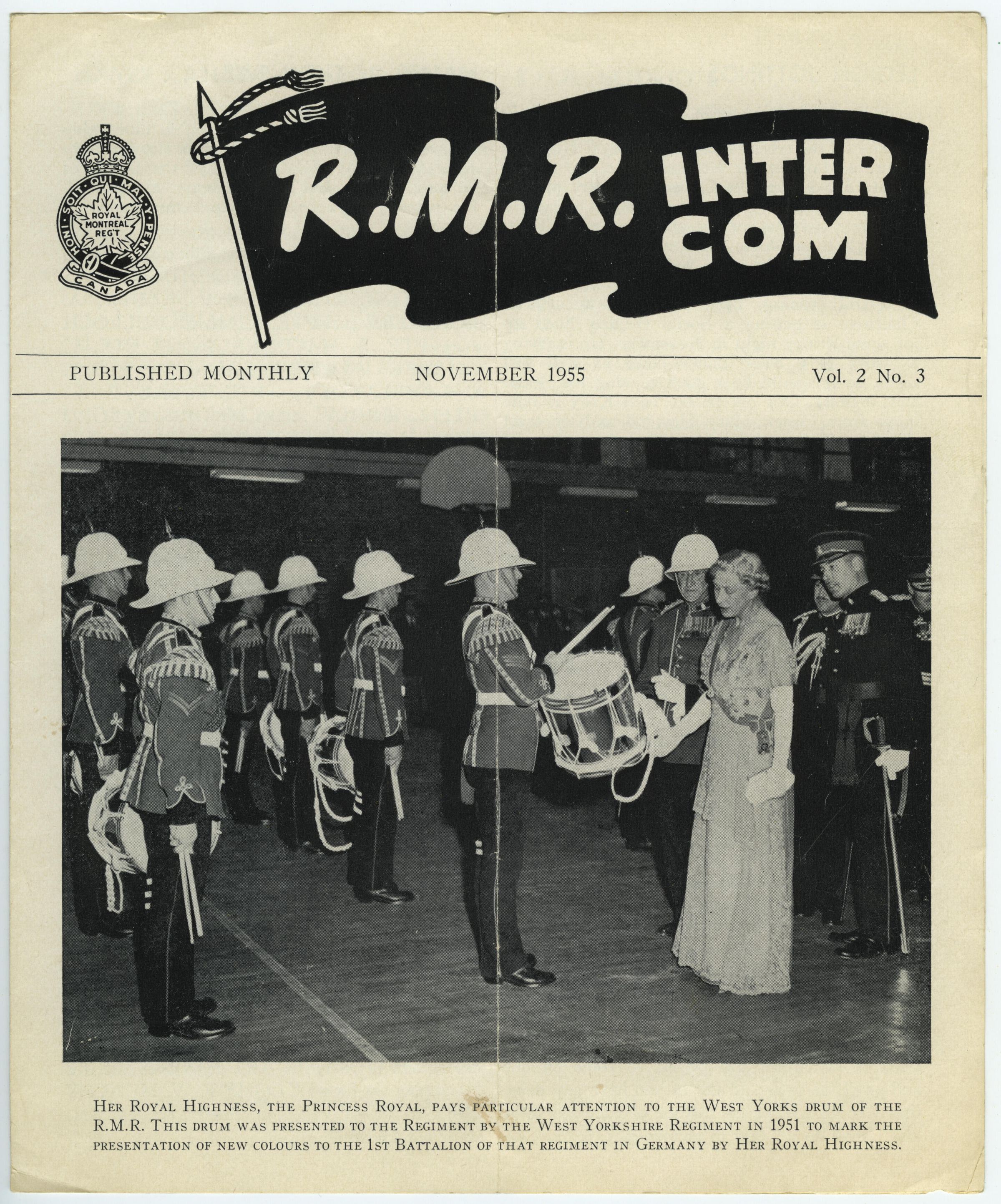 Bonniere, A., Ross, Anthony F., Turnbull, Doug, Lonsdale, C. H., Kelly, Thomas Michael, Byford, Richard, Mary, Princess Royal and Countess of Harewood, Langlands, J. C., McCulloch, R. F. N., Pulling, Bill, Sauve, L., Pike, Walter, Jackson, Thomas Edward, Wheatley, George Joseph, Turner, William Henry, Laing, F., Hughes, E. D., Fesmer, Thomas, Stevens, William George, Muncey, Fred W., MacDonell, S., Embree, C., Woodman, Fred J. H., Pratt, Clifford James, Sirkia, Leo, McCullough, Virgil, Frampton, Leonard, Squires, Jimmy, Watkins, Edward. D., Matthews, Frank G., Pollock, Ian Findlay, Hincks, Arthur Chester, Thomson, Lorne G., Whitlaw, William D., Wood, Stanley, Mitchell, James Albert, Bonnemer, George, Frampton, J., Lower Canada College Cadet Corps, The West Yorkshire Regiment, The Royal Montreal Regiment Association, Branch 14, Royal Canadian Legion, Royal Montreal Regiment Band and Drums