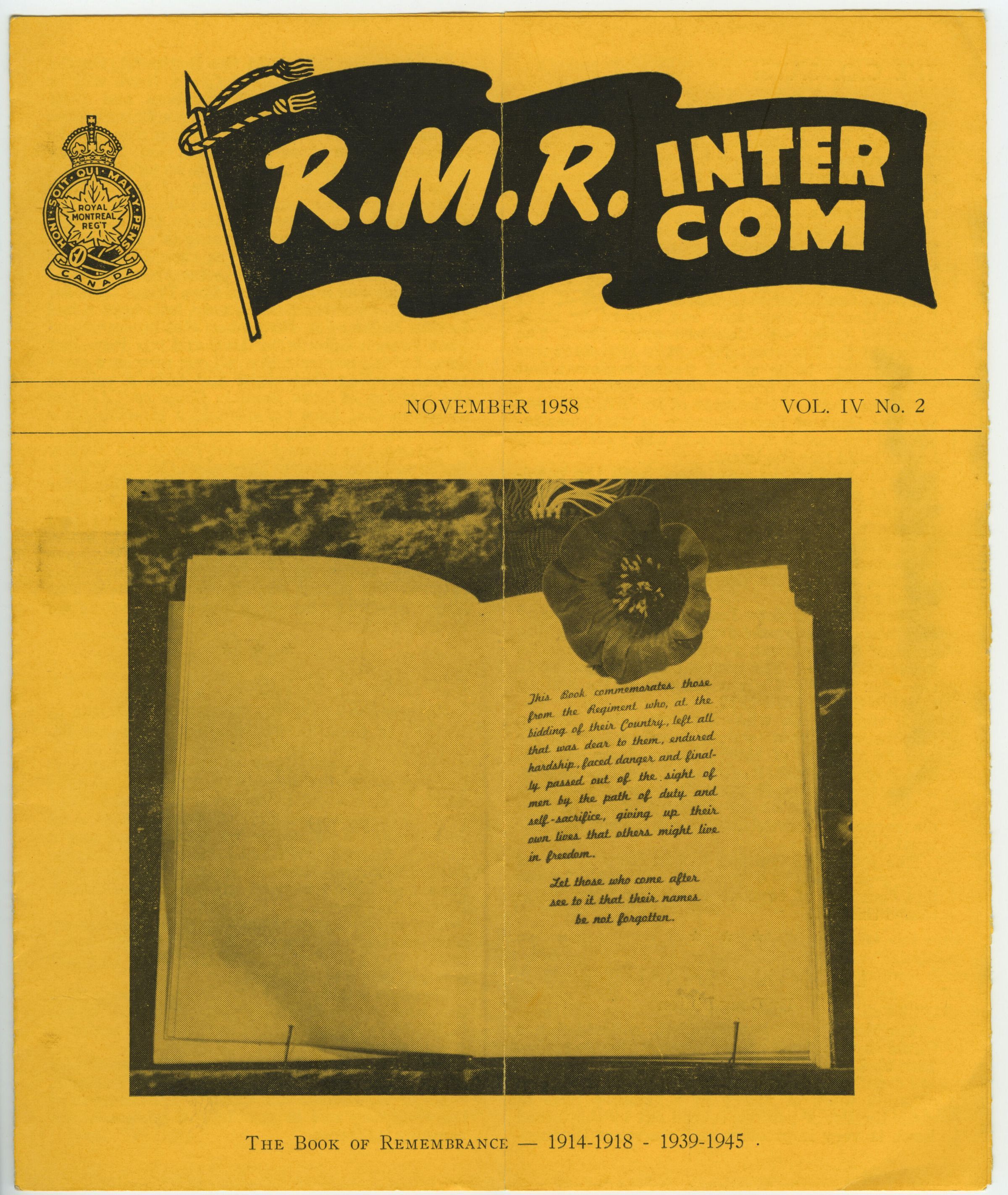 Linton, J. Douglas H., Heater, Roger S., Green, Arthur, Bernaquez, Wall, Frank, Derocher, Crosby, John Leo, Goyette, G., Wheaton, Tom, Vass, David McDougall, Limoges, Harflett, Charles Albert., Noseworthy, Theodore Edward, Barre, Paul Herbert, Pichette, A. H., Hincks, Arthur Chester, Howell, William Percy, Searon, Stone, A., Wheaton, Robert A., Crouch, Arthur Mandeville, Unsworth, J., Ellement, E., Newcombe, Douglas William, Nurse, Edward P., Belanger, R, Deeks, Doug, Easler, Kenneth Alger, Wheatley, George Joseph, Watkins, Edward. D., Glen, Harry, Bent, Herbert Sommer, Rehill, Donald MacDougall, Searon, Mitchell, James Albert, Jaggers, R., Burrows, Frank, Corbett, John Edward Ross Alexander, Cannon, Robert, Checketts, George Douglas T., Lloyd-Craig, Peter, McKinnell, Robert B., Civitarese, J, Reinhard, Hand, Harry, Carpenter, William Henry, Cummings, Frank, Crosbie, Billington, Cummings, Robert, Overing, Robert Laurence Reginald, Goldstein, Harold, Allen, Jack R., Green, William, Stacey, Cyril, Thomson, Lorne G., Nichols, Fafard, Frank, Smythe, R. E., McCurdie, J., Piccioni, F., Whitlaw, William D., St. Clair, Alexander D., Massey, Robert Bruce, Mingo, A. William, Spark, Peter Arthur, Starkey, George, Donnelly, Jack J., MacDonald, David D., Bloom, Liddell, Stuart, Desormeaux, Fleming, Alex H., Kennedy, James Taylor, Gwyn, Julian Reginald Desgrand Jermy, Dalgleish, Gordon Grant, O'Brien, Lou, Budd, Michael T. W., Murray, Vernon Alexander, The Royal Montreal Regiment Association, Branch 14, Royal Canadian Legion, Royal Montreal Regiment Band and Drums