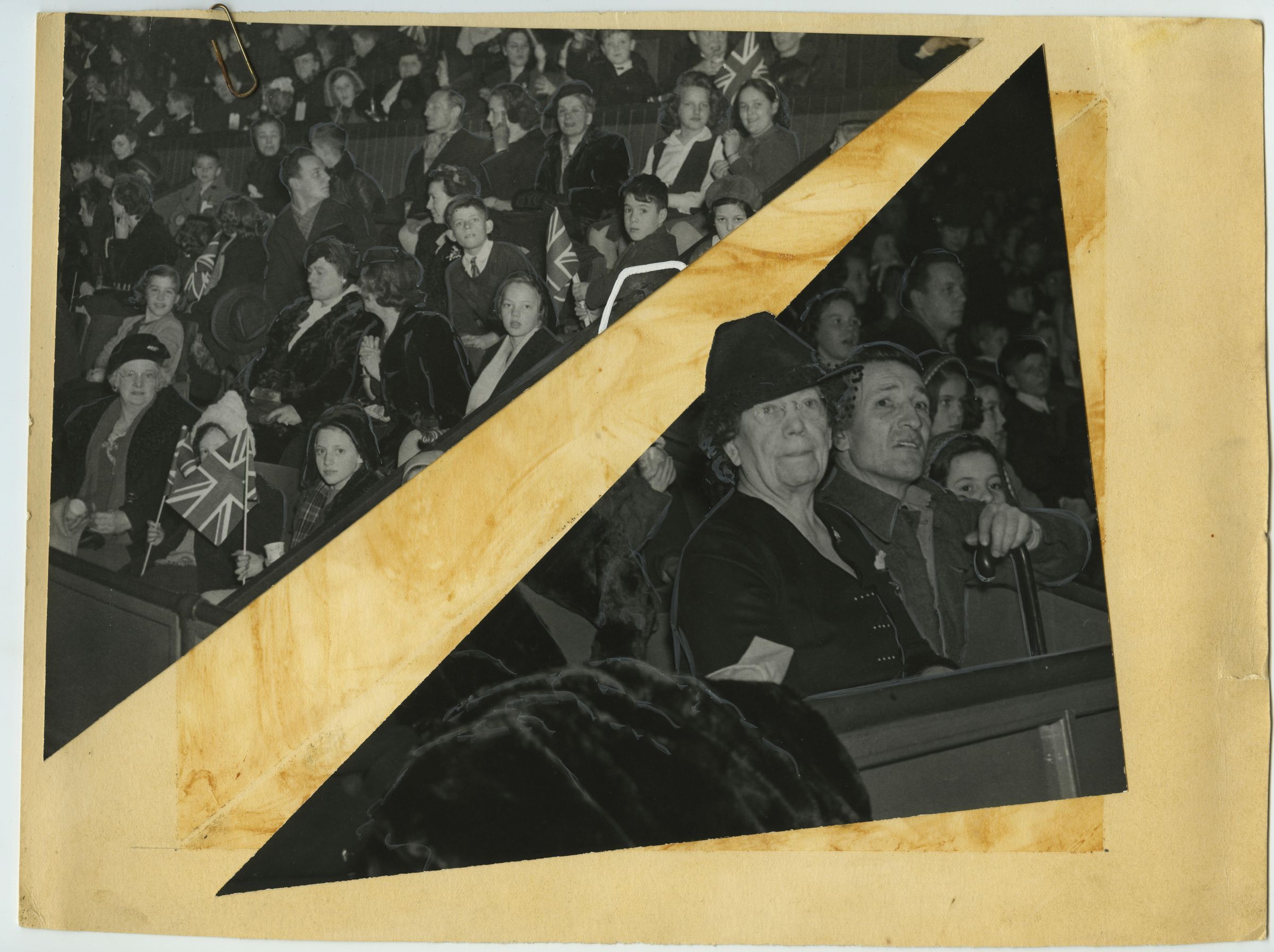 It would appear that this portion of the activity took place in an arena. The ladies are wearing their fur coats. Sergeant W. Kowalski back from service in Europe is equipped with a walking cane.Photograph Details