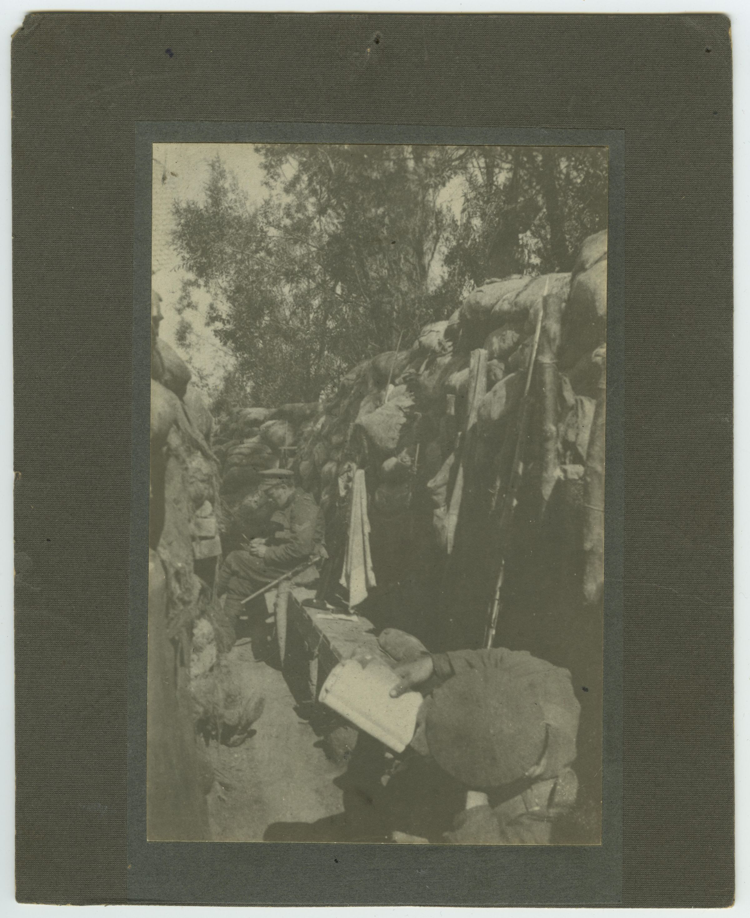 A picture mounted on black cardboard. Soldiers in a trench are reading or writing. Trees in the background are full of leaves . Taken by Pte H. G. Brewer