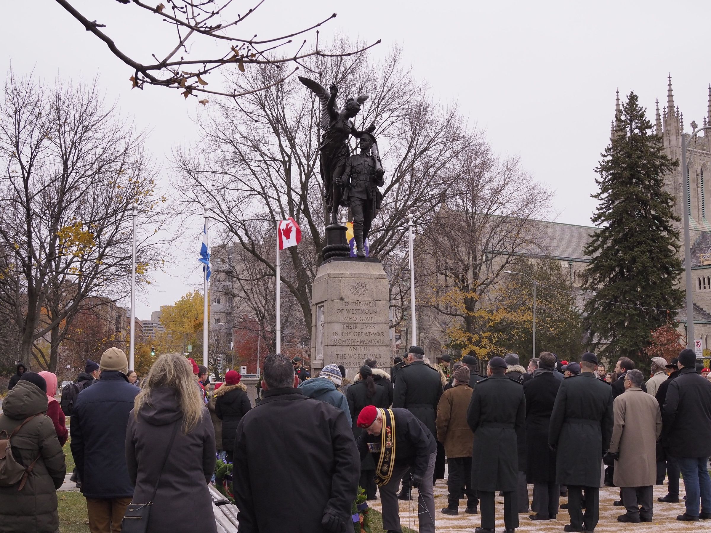 RMR Remembrance day ceremony in Vimy Park at the Westmount Cenotaph. Civilians gather around the cenotaph. A member of the RMR association (red beret) is in the front. The Quebec, Westmount and Canadian flag fly behind the cenotaph. Westmount's Ascension of Our Lord Catholic Church is in the background.