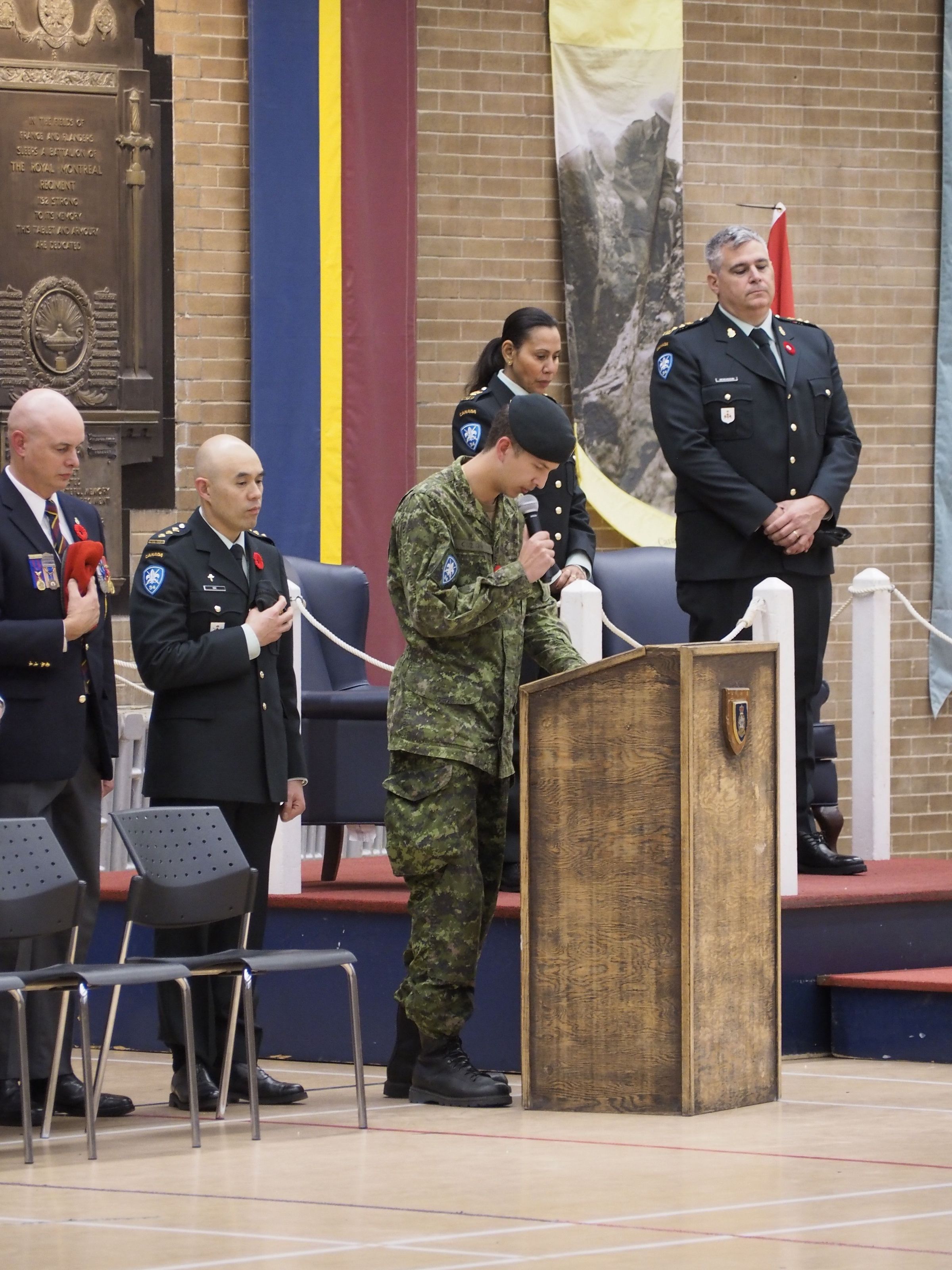 A RMR soldiers reads the names of fallen RMRs from WW1 and WW2. Honoraries Isabel Racicot and David Bensadoun stand behind him on the platform. The RMR's Padre and Lt-Col (rt'd) Colin Robinson stand to his left. This is a part of the RMR's Remembrance Day Ceremony on November 9, 2025.