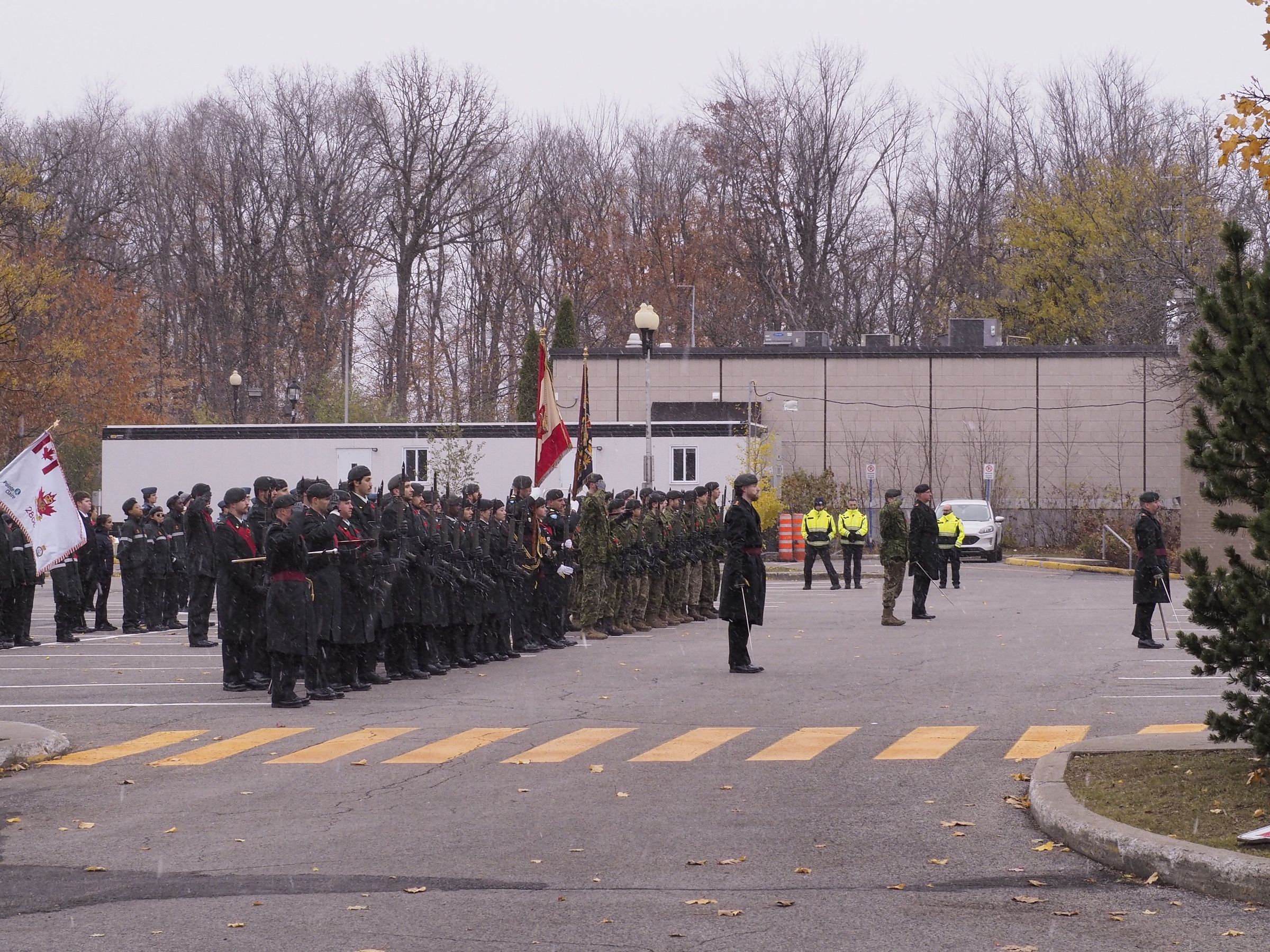 RMRs lined up for the 2025 Remembrance Day Parade on November 09, 2025 in Pointe-Claire. The first line of RMRs are in DEUs and combats, with the five person colour party in the centre. Behind are cadets lined up.