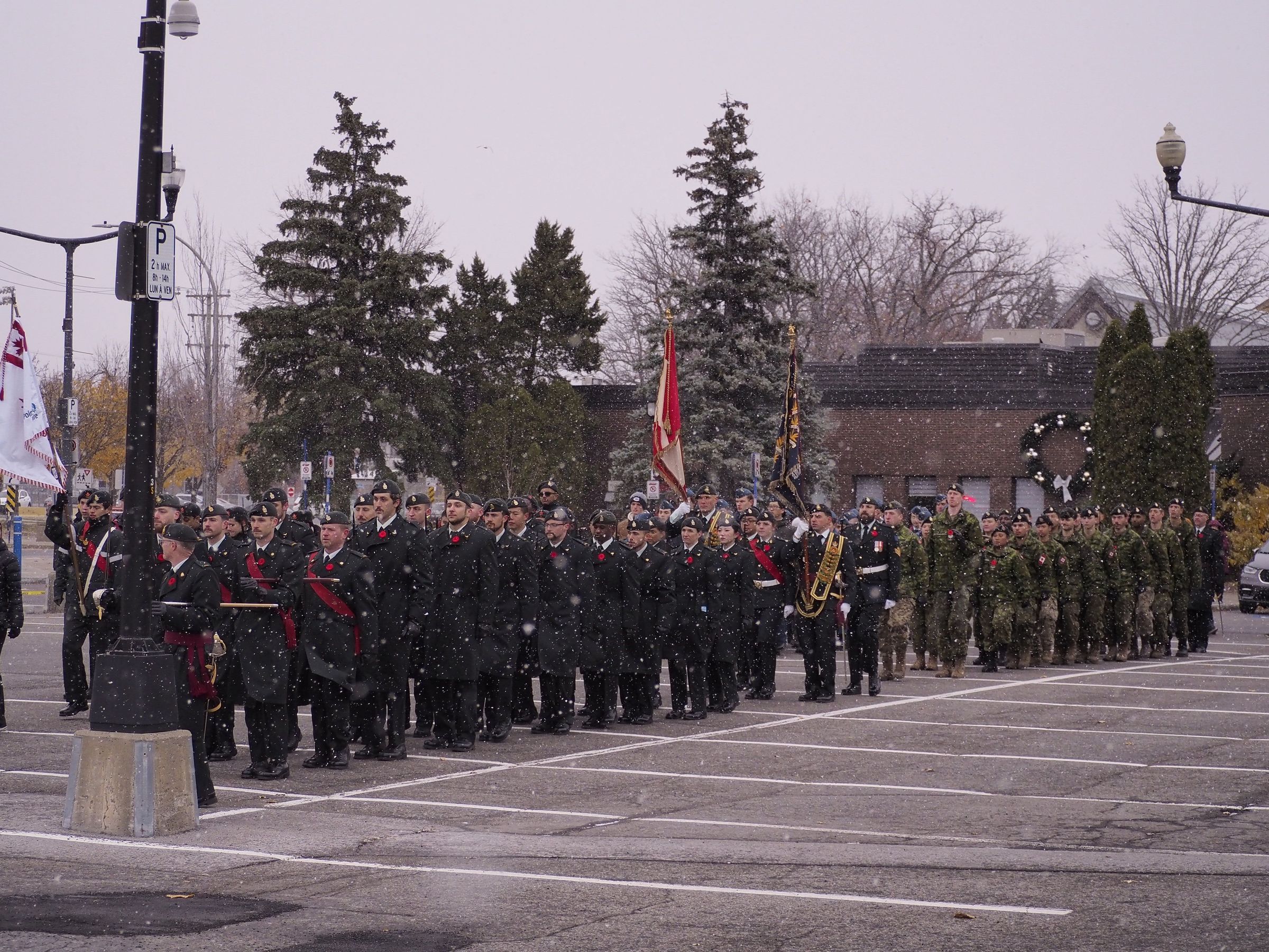 RMR soldiers on parade for Remembrance Day in Pointe-Claire on November 9, 2025. They are in a parking lot in formation. It is snowing.