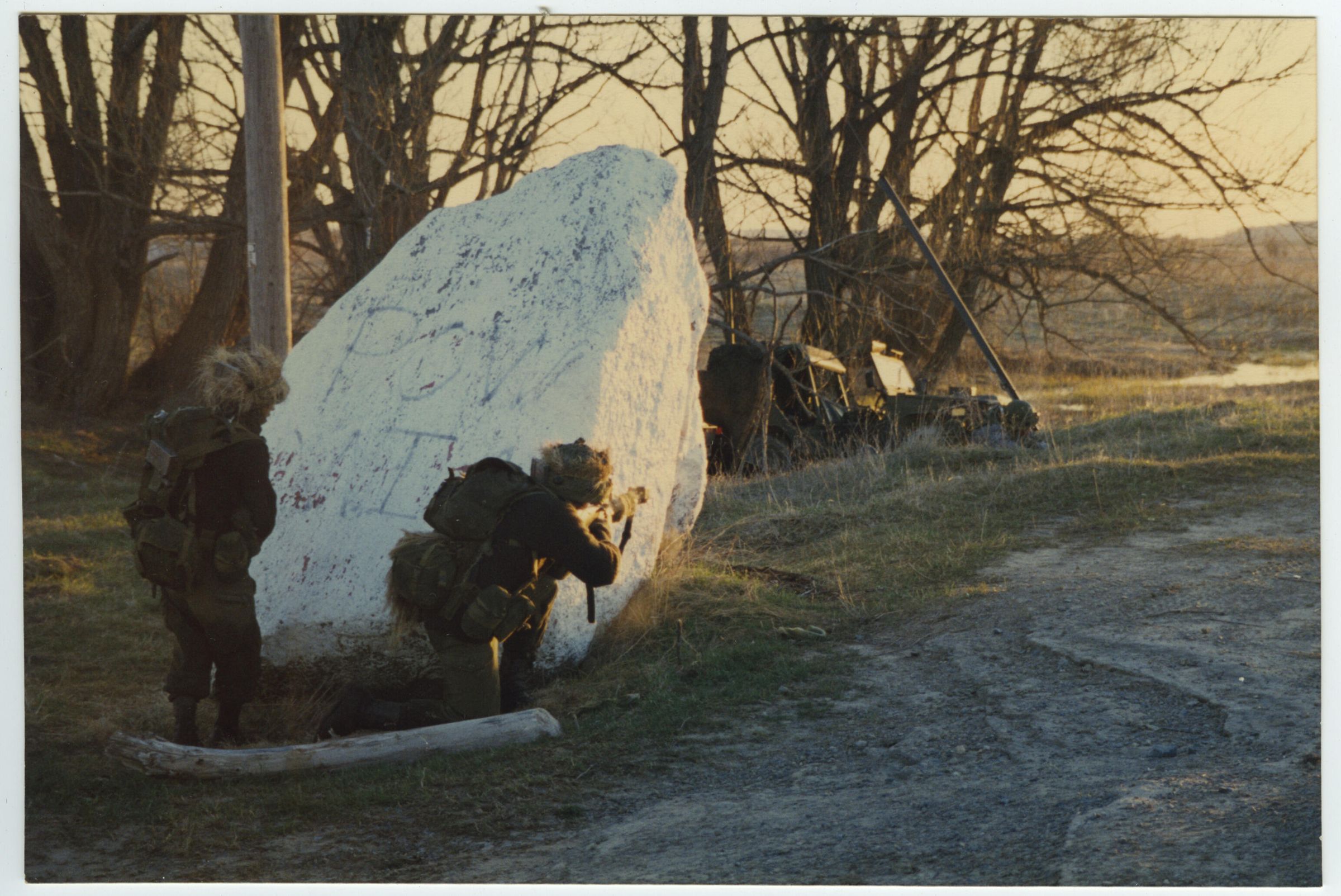 Two RMR soldiers practicing an attack at dawn and clearing the enemy position while cross-training with National Guard Soldiers at Fort Drum, in New York. They are using the MILES System.Photograph Details