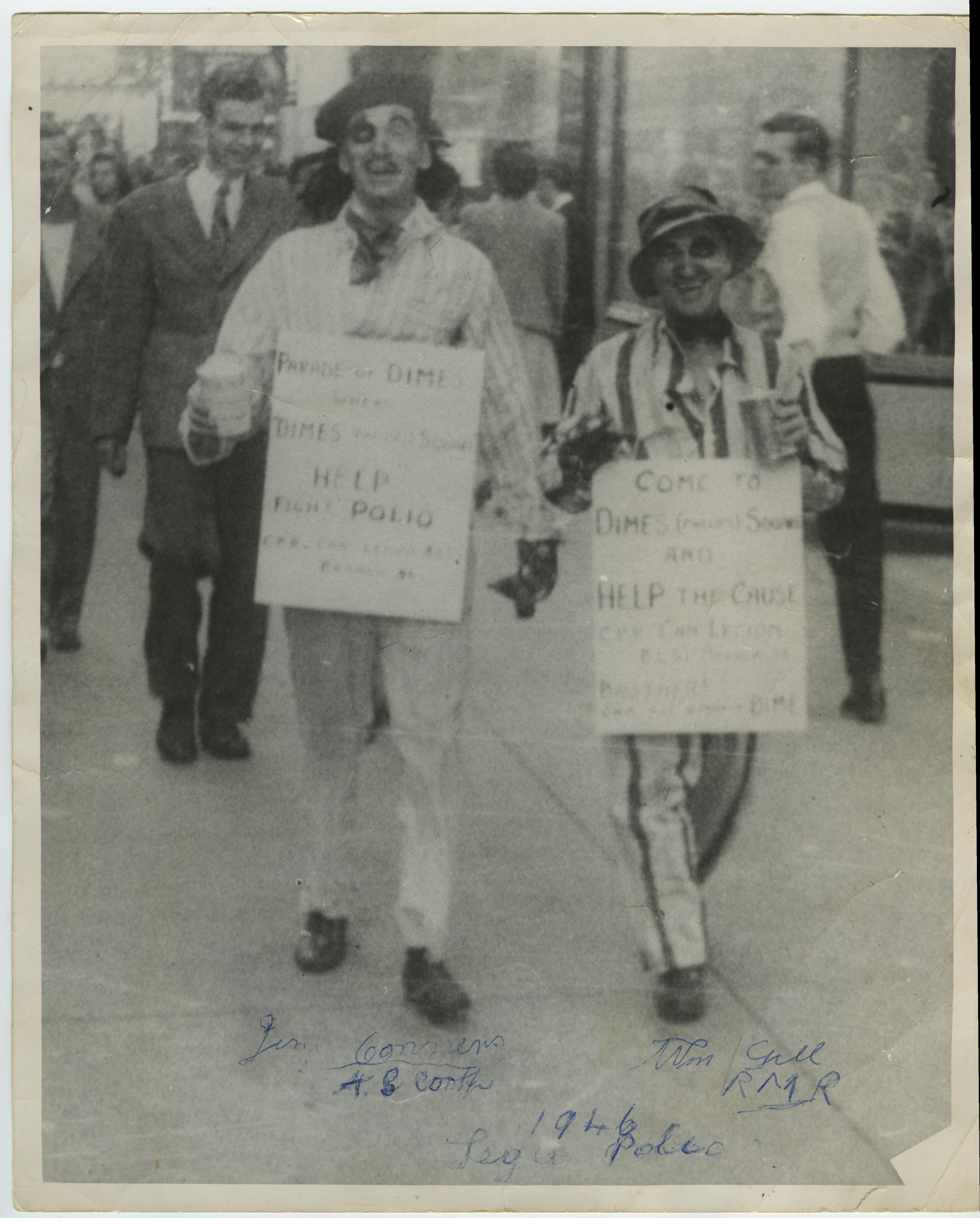 A black and white photo of two members of the RMR Association, Branch 14, Royal Canadian Legion, dressing up and participating in a fundraising effort to beat POLIO.Photograph Details