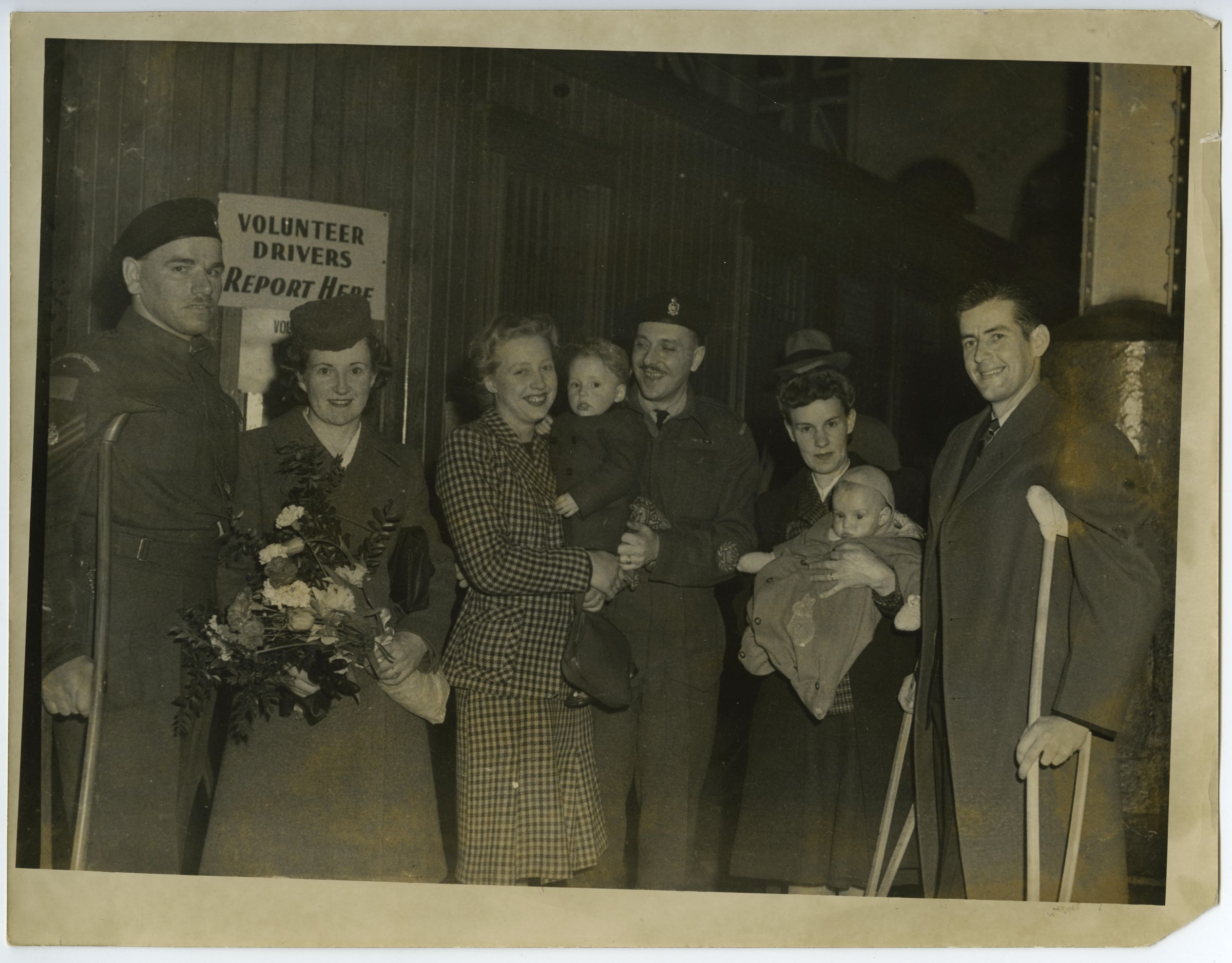 A black and white photo of members of The Royal Montreal Regiment who first travelled oversea in 1939. Here they are welcoming their English War brides to Canada at Bonaventure Station. They had to travel on separate transport ships.Photograph Details