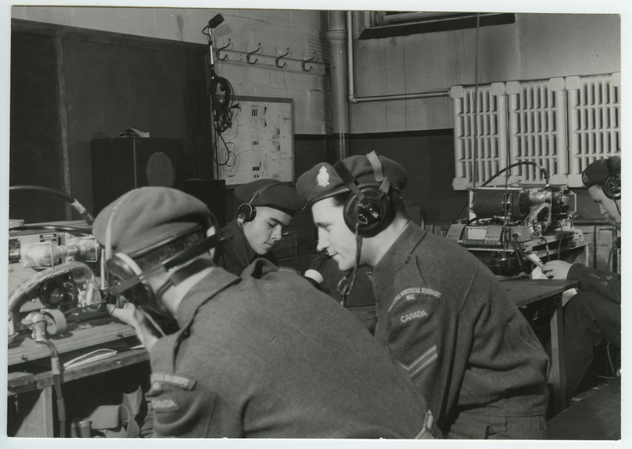 Four uniformed men of the 2nd Battalion's Signals Section seated in the Signals Training room practicing voice proceedure. On their heads are headsets and in front of them are No. 19 radio sets.Photograph Details