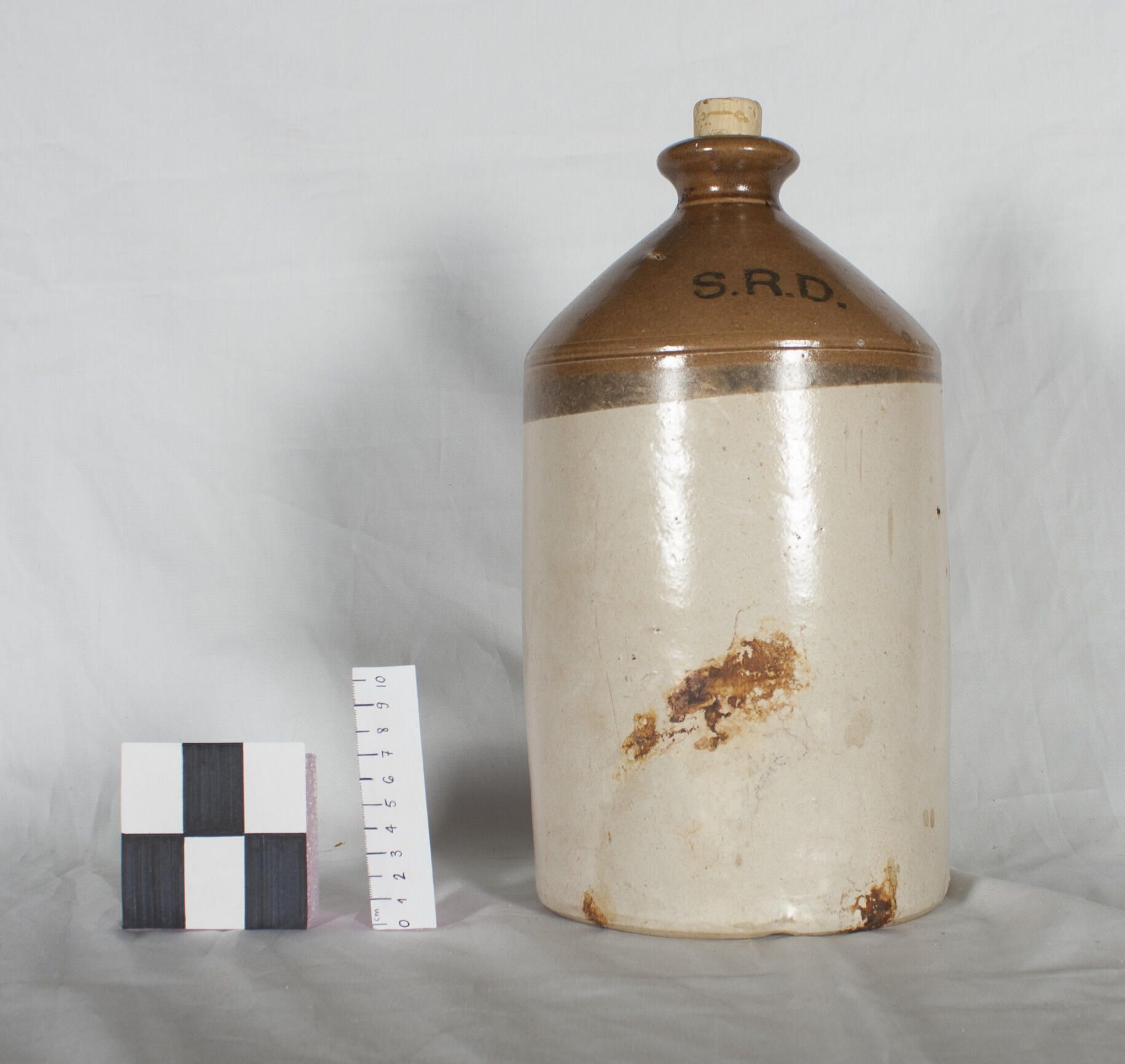 Original era manufactured, two-colour, ceramic rum jug. It stands 13 inches in height and is closed with a cork stopper. Painted into the glaze finish are the letters S.R.D (Supply Reserve Depot).
