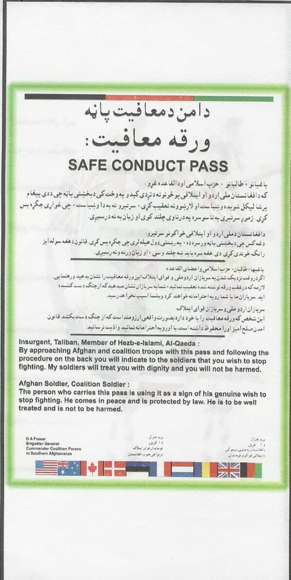 A leaflet to be used as a safe-conduct pass by the Taliban upon surrender. On the verso, the leaflet explains the procedure of a safe surrender. These leaflets were typically dropped by aircraft over a targeted area before a military operation. The leaflets were generally written in Pashto, Dari and English.Archive Details