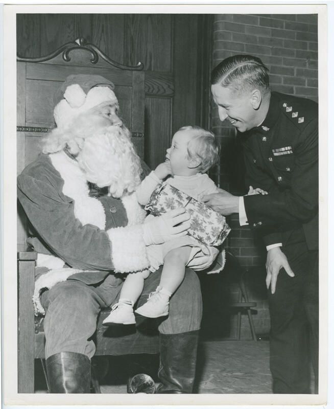 A photograph and a newspaper clipping showing Santa Claus holding small children at two different Regimental Christmas parties in the 1950s.Photograph Details