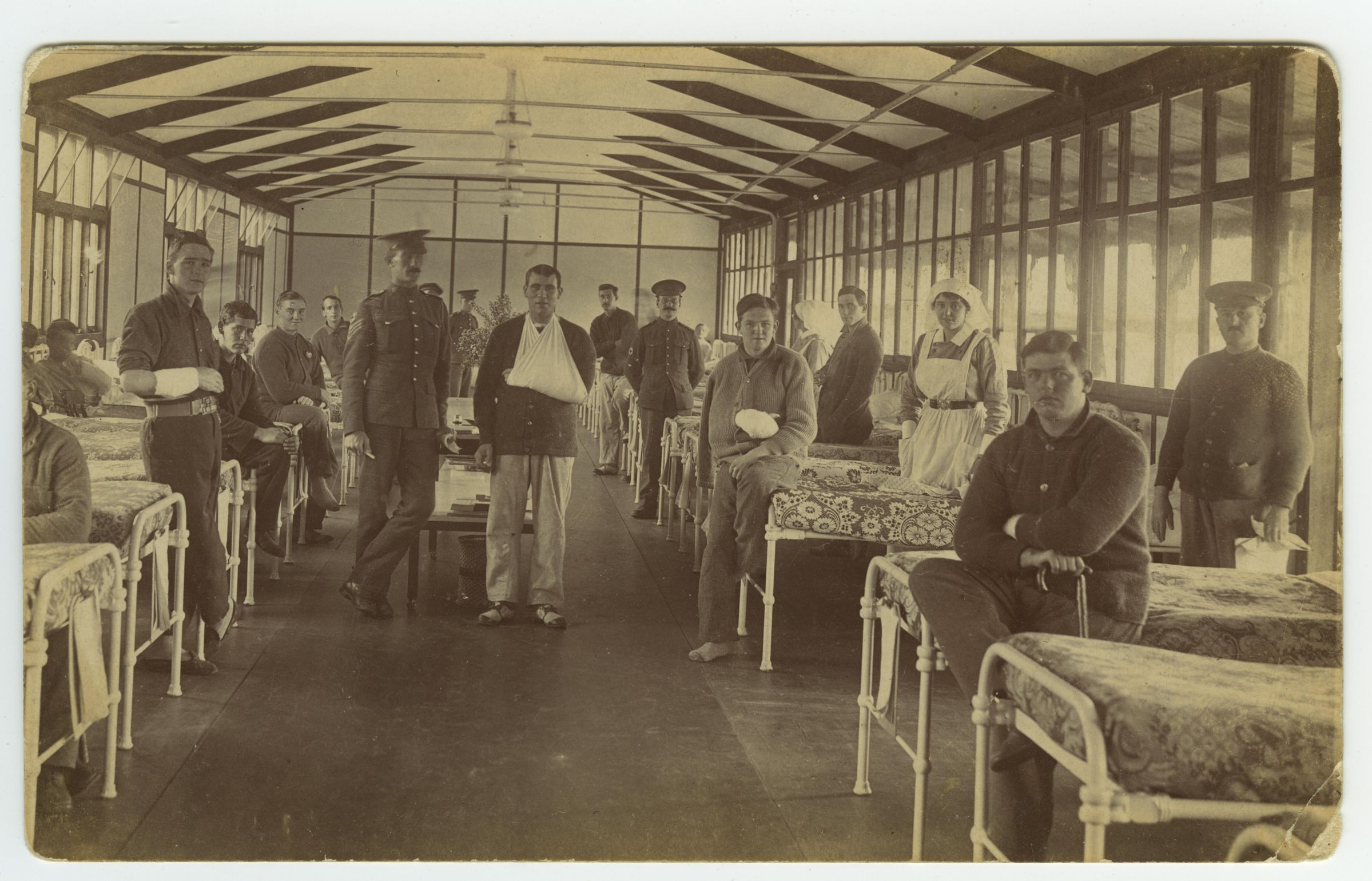 A military hospital ward with rows of beds on both sides. Many soldiers are standing around, several displaying bandages of one sort or another, and several nurses stand in the background.Made/Created