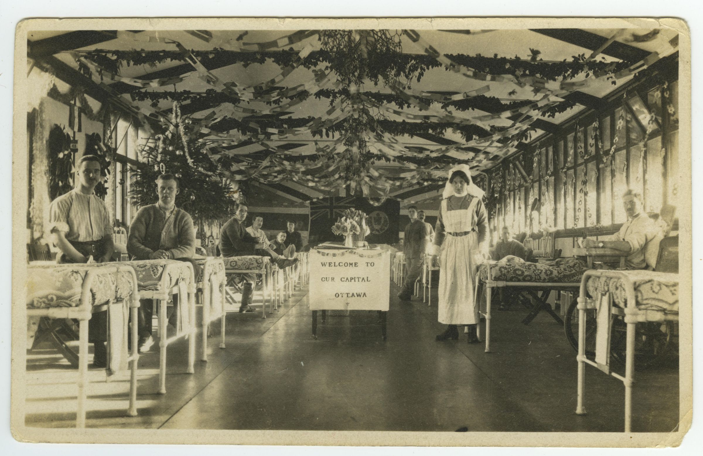 A military hospital ward with rows of beds aligned on both sides. In the middle a nurse is standing beside a table from which is hung a sign with the words "Welcome to Our Capital Ottawa." In the beds are wounded soldiers either sitting or lying. The ceiling is hung with garlands of some sort and a large Union Jack flag is visible on the far end wall.Photograph Details
