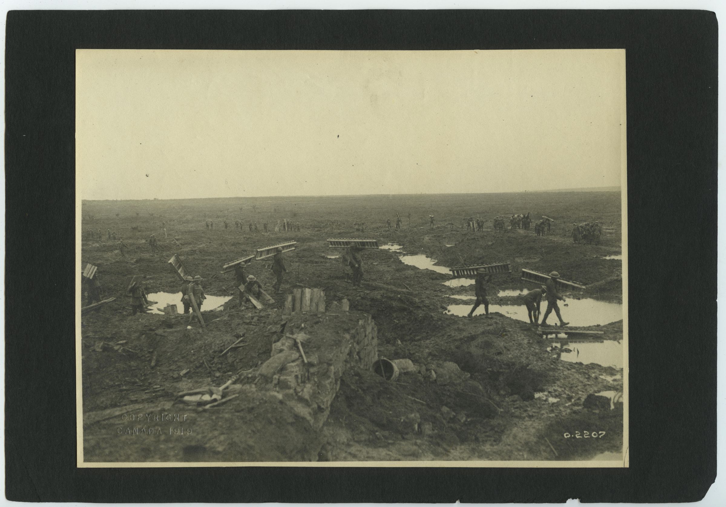 Two lines of Canadian soldiers moving to the right across the Passchendaele battlefield. The ground is covered with shell craters filled with water. Many of the soldiers are carrying wooden "duck boards" or trench mats. These are used to help cross water filled ground or to provide drier footing in water filled trenches.Photograph Details