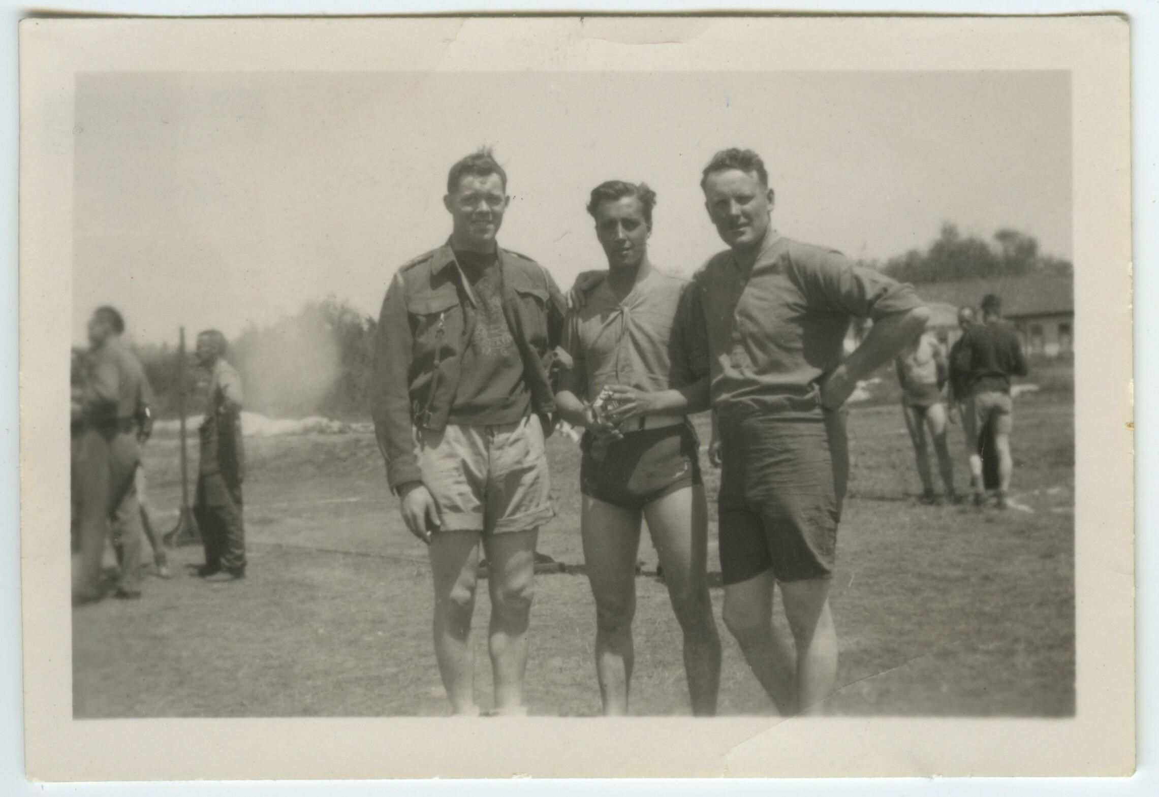 A black and white photo of members of the 1st Battalion RMR, in various forms of sports and swim dress. In England between 1939 and 1944 the troops trained extensively while also reserving time for physical fitness training and sporting activities.Photograph Details