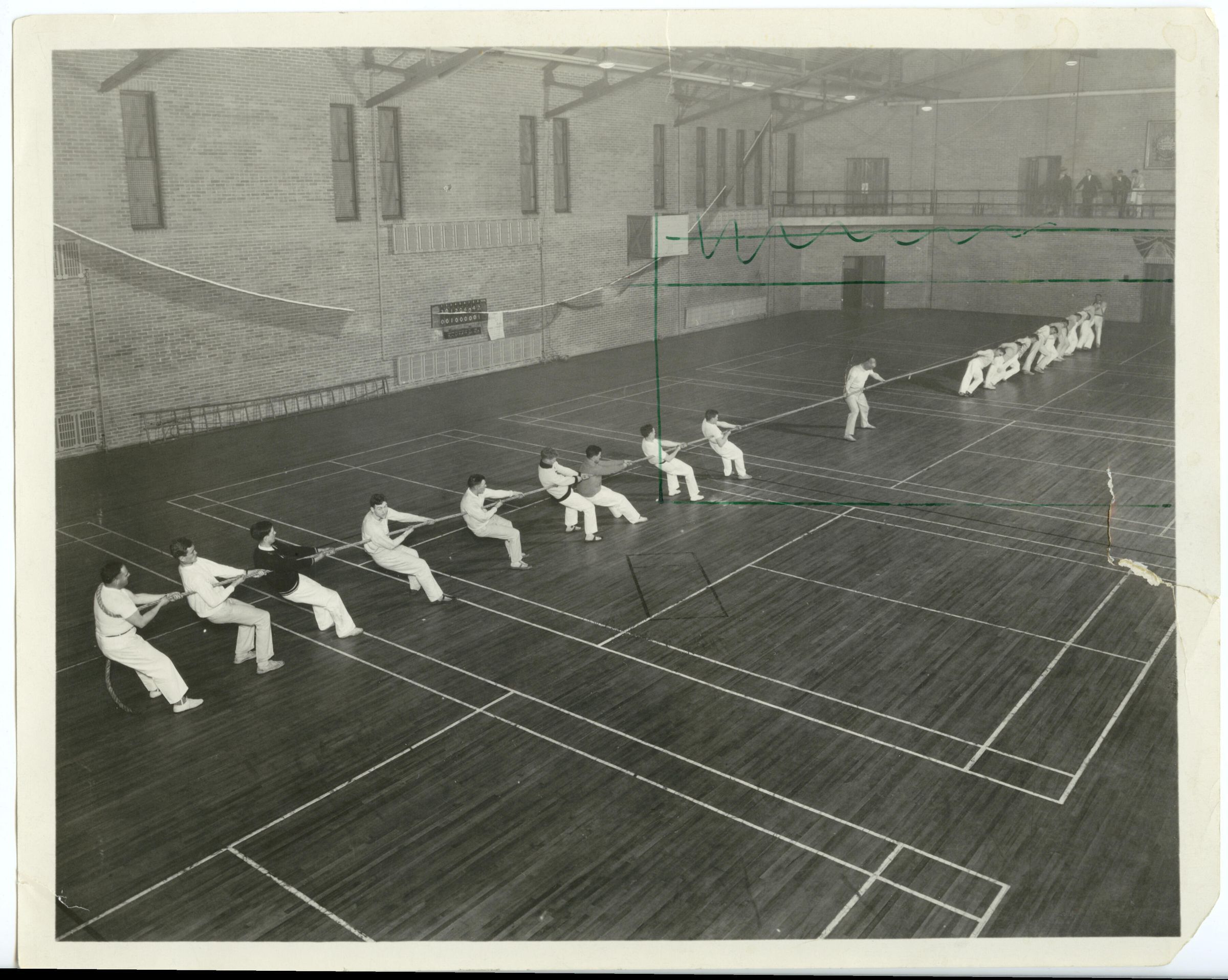 A photograph of a tug-of-war taking place on the main floor of The Royal Montreal Regiment armoury. Almost all the competitors on both teams are dressed in white slacks and tops.