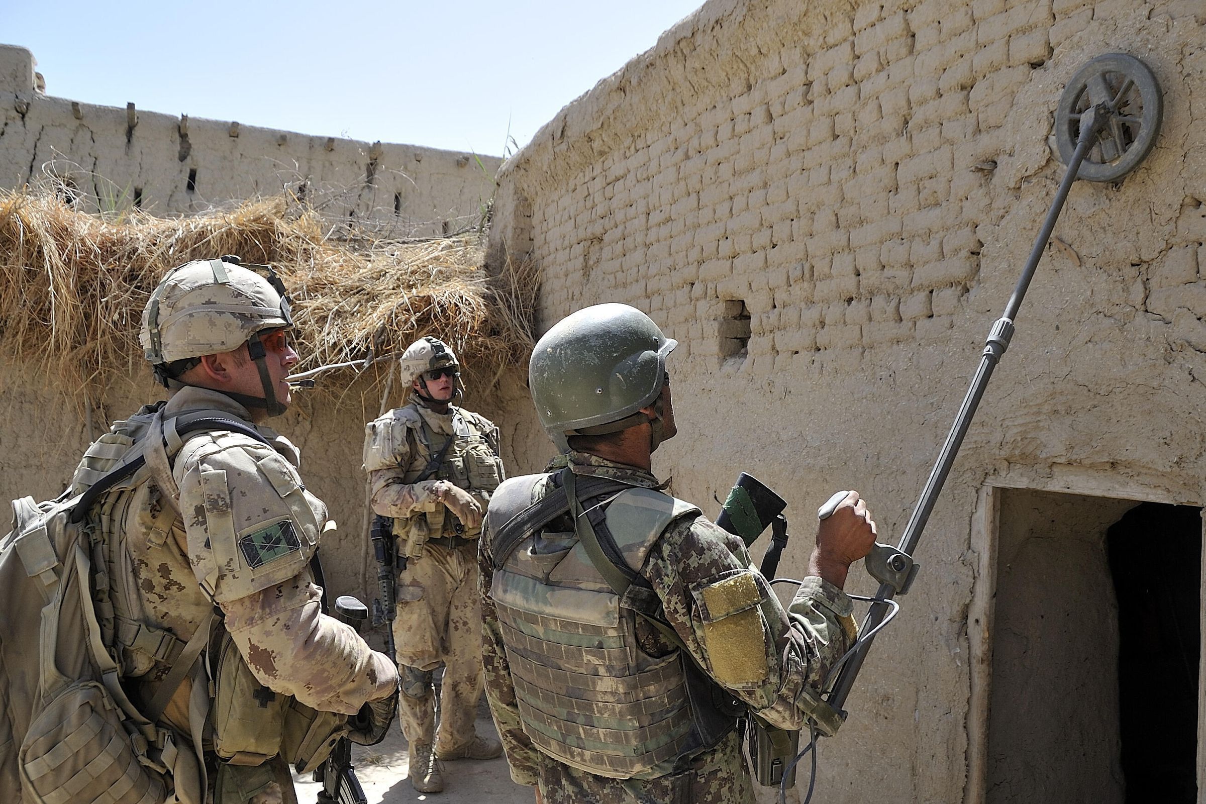 Afghan Soldier, accompanied by Canadian Engineers, sweeping the mud wall of an Afghan building with a metal detector looking for embedded mines or booby-traps.