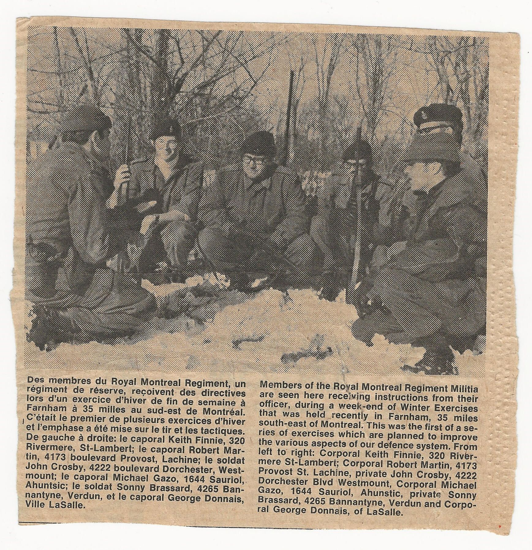 Newspaper clipping showing a photograph of part of an infantry section being briefed by the section commander during a Winter Warfare Exercise in Farnham. The photograph is followed by a short article in both French and English.