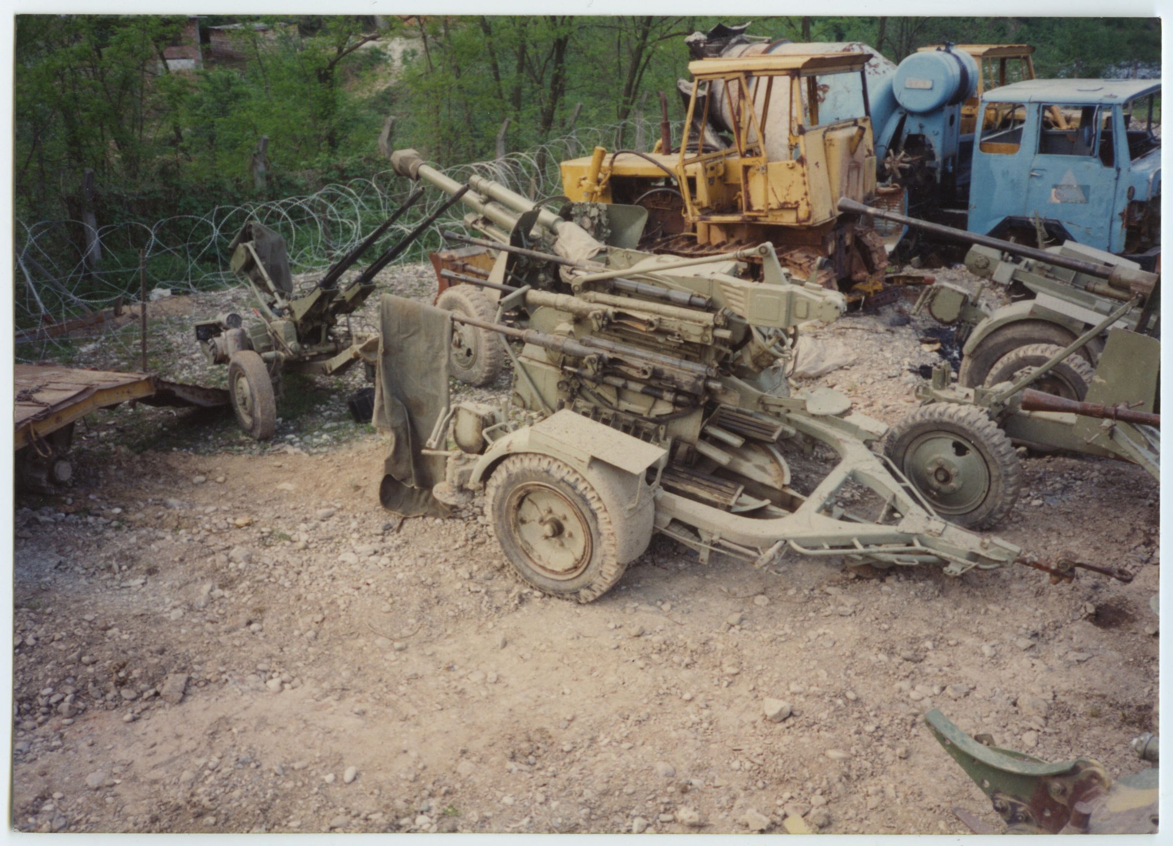 Seized weapons in the UNPROFOR holding area of Bosnia. A World War II German Flakvierling 38 is located in the foreground. In the background to the left are two Soviet K61, 37mm guns. Behind the German Flakvierling is a Soviet 76 mm divisional gun M1942 (ZiS-3).Photograph Details