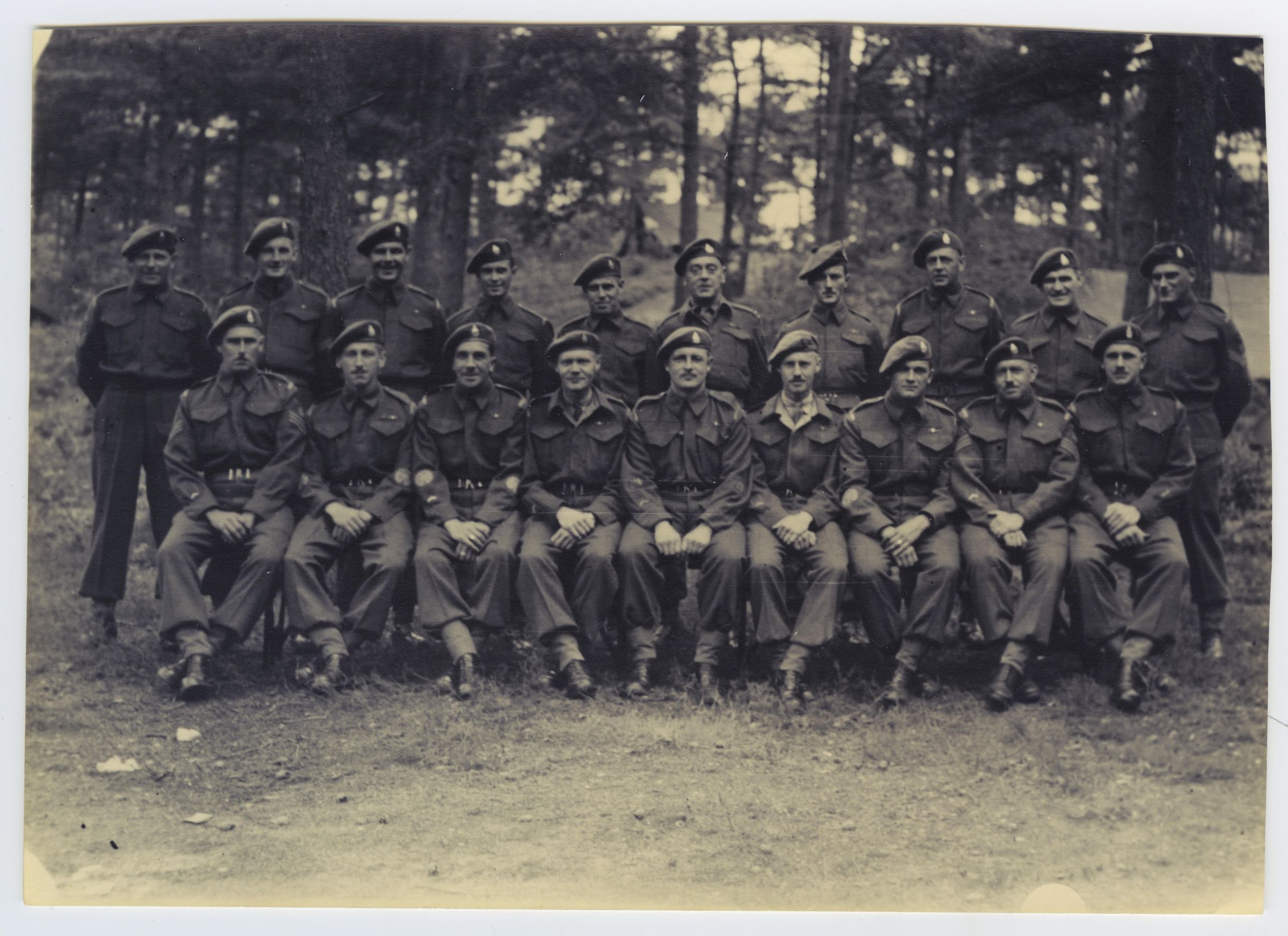 A group picture of the Senior NCOs of the 1st Canadian Army Defence Company (RMR) in Apeldoorn, Netherlands, with with Majors M.A. Willis and R. Schwob, seated on either side of WO1 (RSM) G.H. Quinn (Centre)Photograph Details