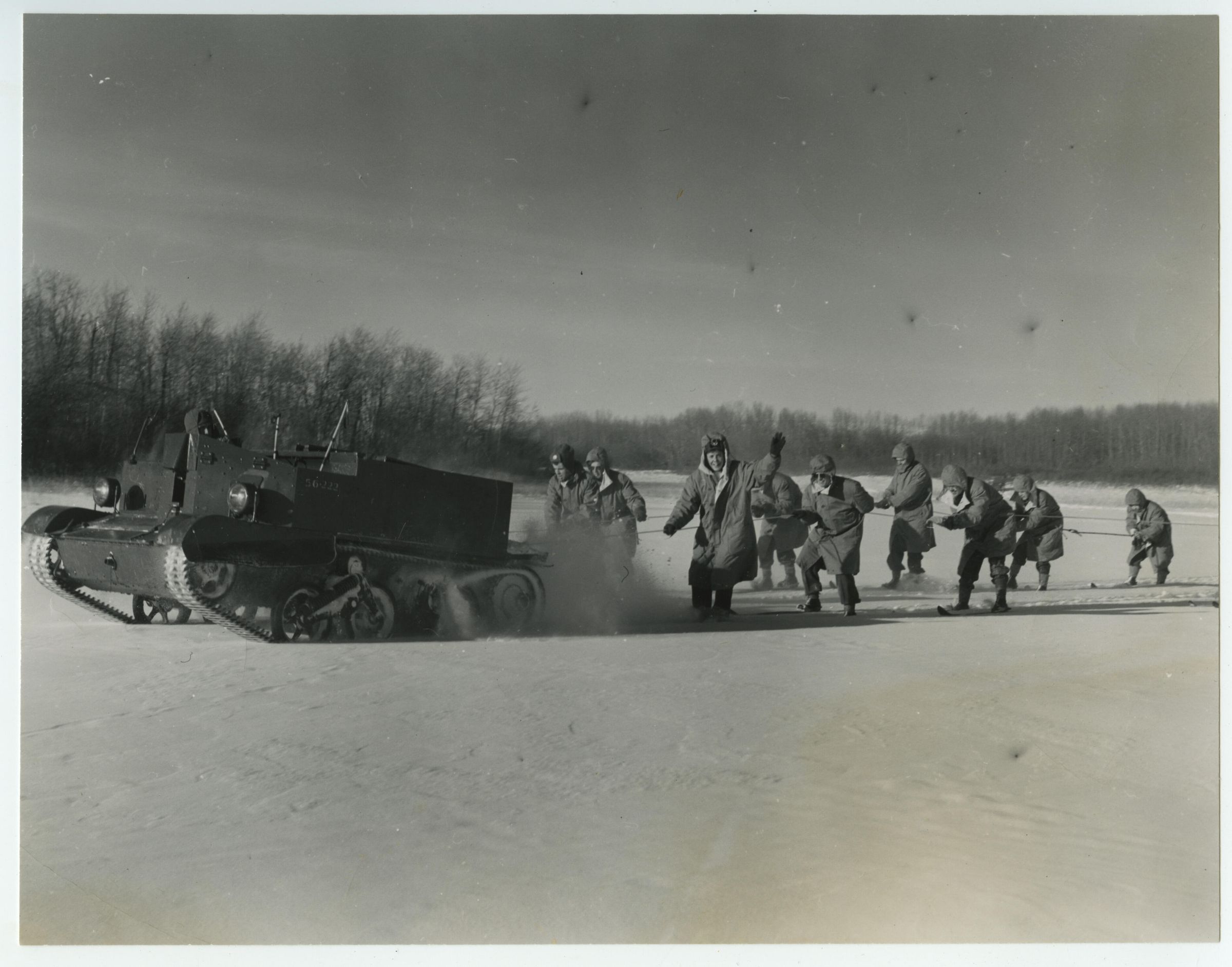 Soldiers of The Royal Montreal Regiment wearing their winter equipment while conducting training on skis in Farnham Camp. They are being pulled by a universal carrier and one is waving to the camera.Photograph Details