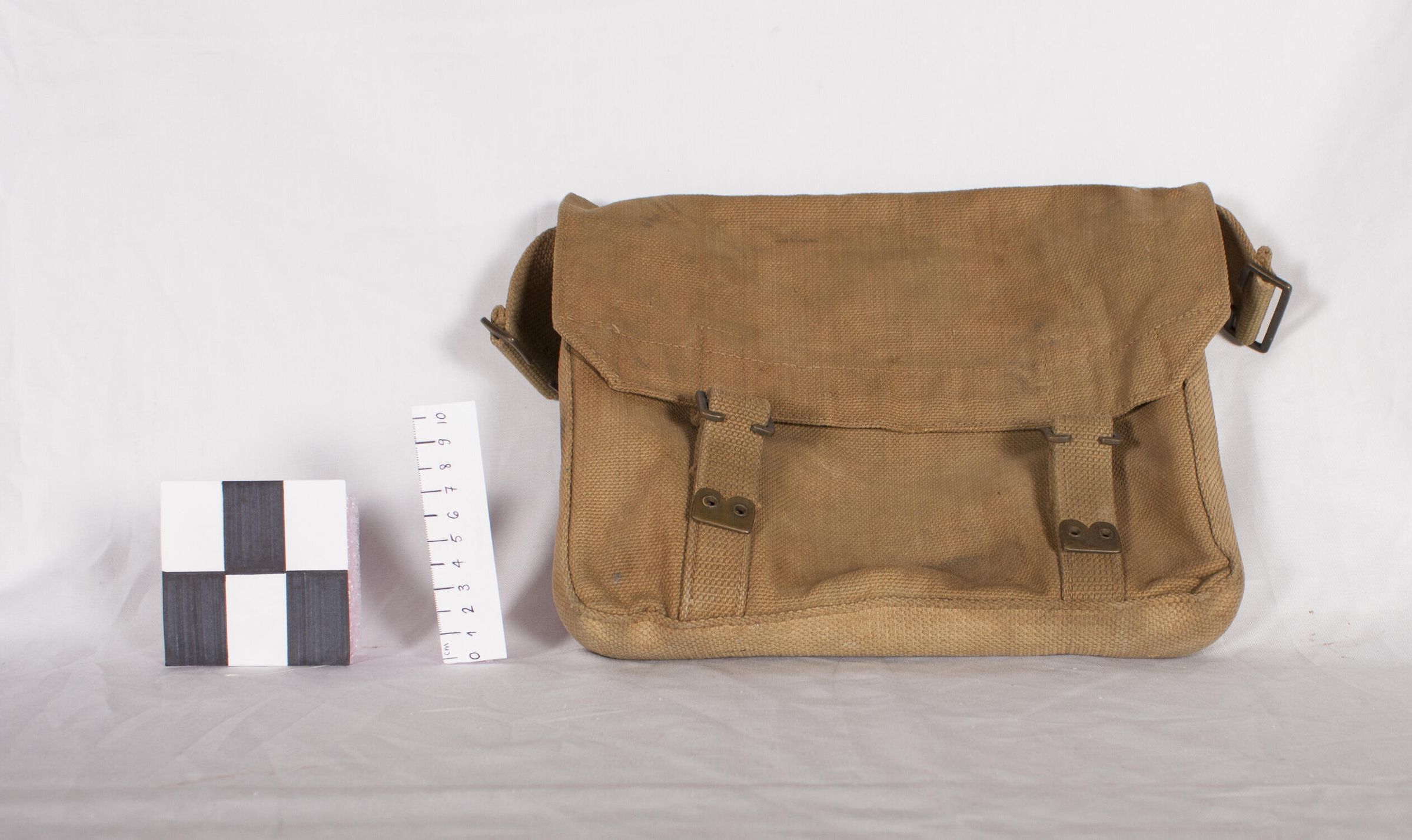 Model 1908 rectangular webbing haversack. At the rear, there are two 2-inch web tabs angled outwards at the top, along with two short 1-inch buckles. At the bottom are two 1-inch web loops. The buckles and tab ends are made of brass.Made/Created