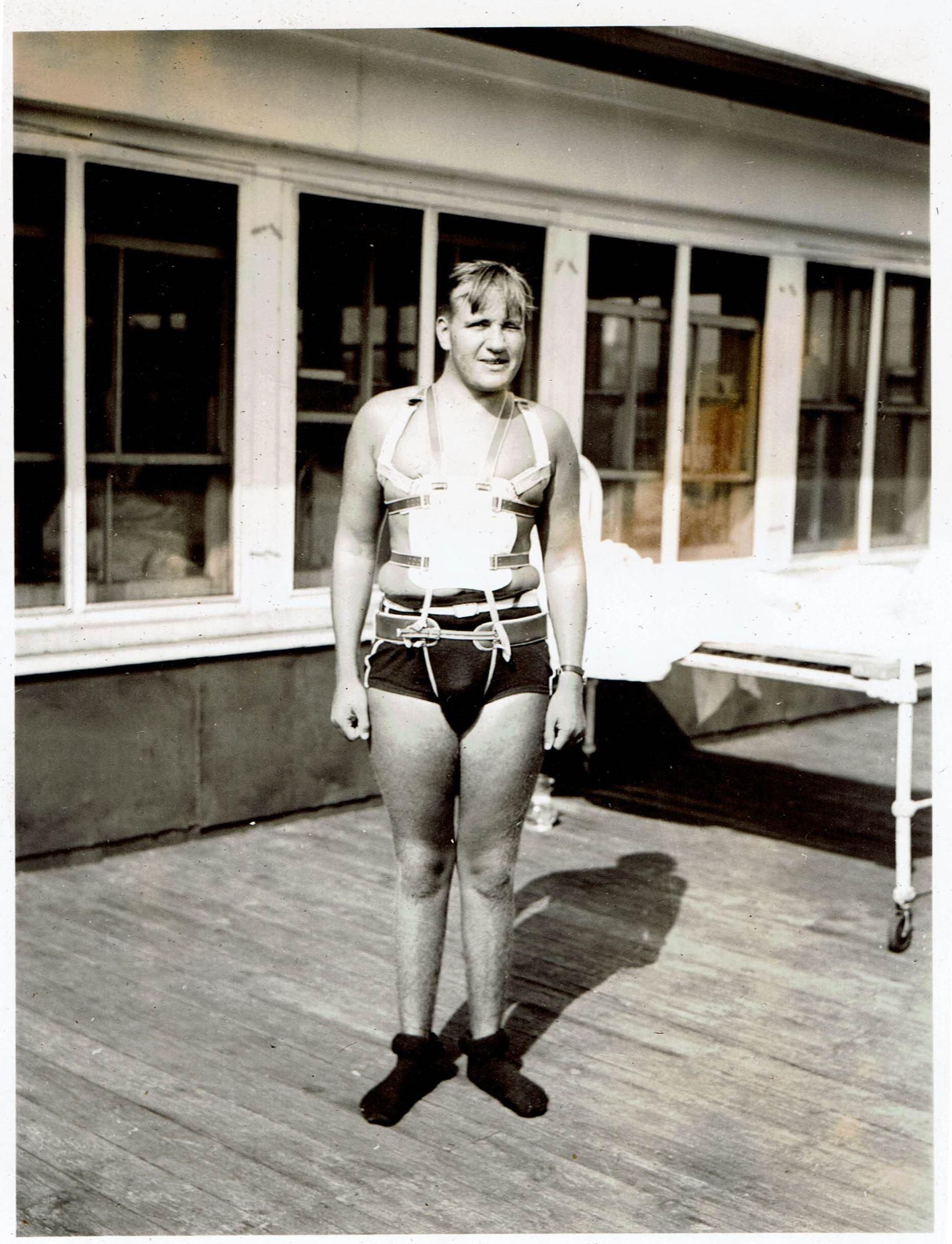 A black and white photo of an injured soldier only identified was "Lasalle". He is on the rooftop deck of the Christie Street Military Hospital wearing an intricate brace.Photograph Details