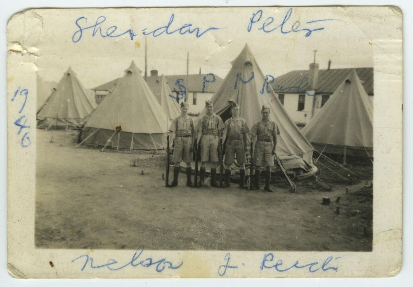 Four men in battledress uniform are standing in front of a bell tent at Valcartier Camp, Quebec. During World War II Valcartier Camp was an Infantry Training Centre and these men would be there for training before leaving for England.Photograph Details