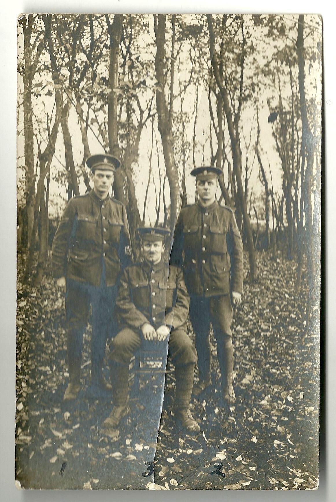 Three unidentified NCO's are posing in the woods. Two of them are standing and one is sitting.Made/Created
