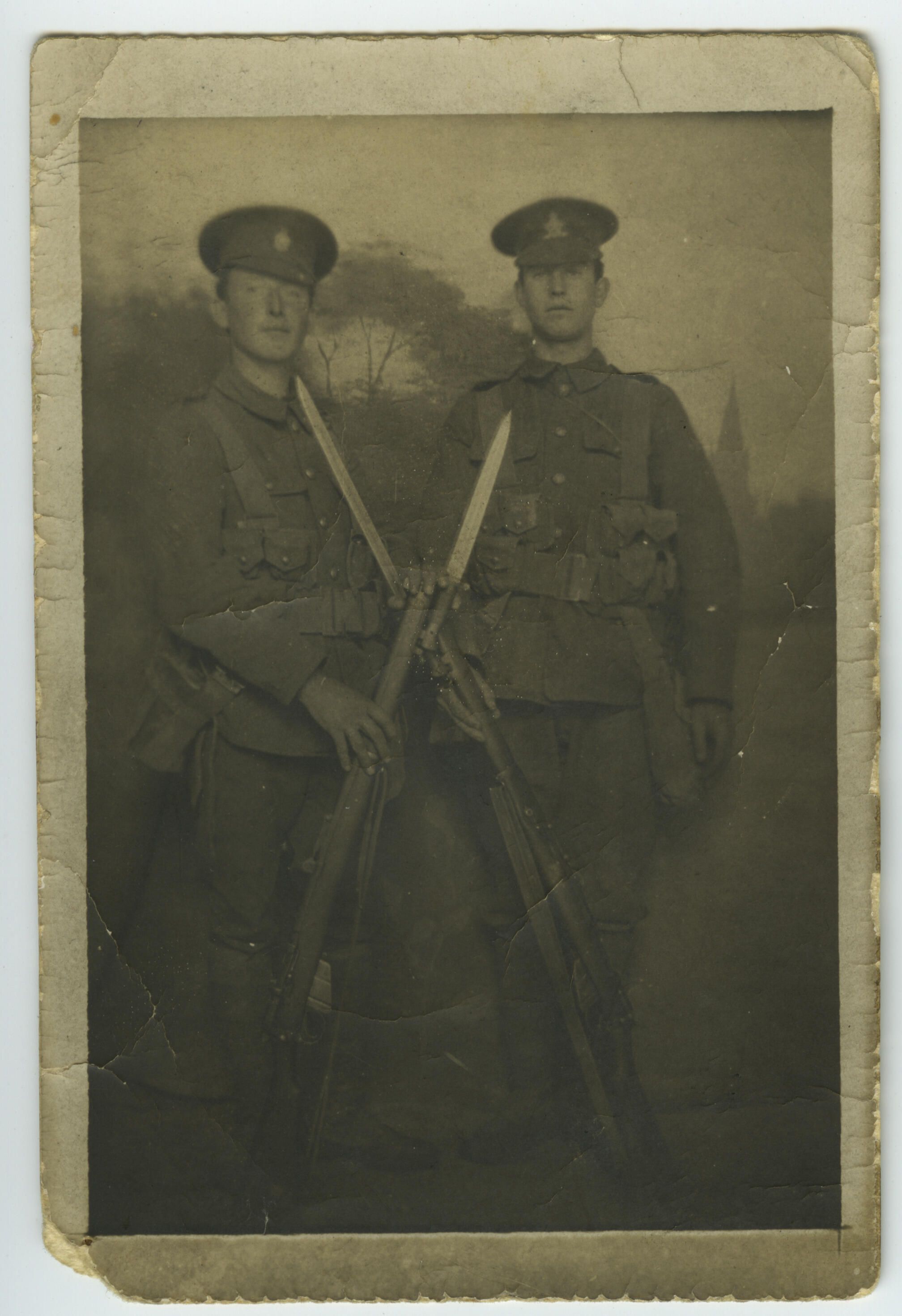 A group of two soldiers, wearing webbing (load carrying gear) with crossed rifles and bayonets fixed in their right hands. The rifles appear to be of two different models used by Canadian troops in WW I, (the British "Lee Enfield" & the Canadian "Ross" ).