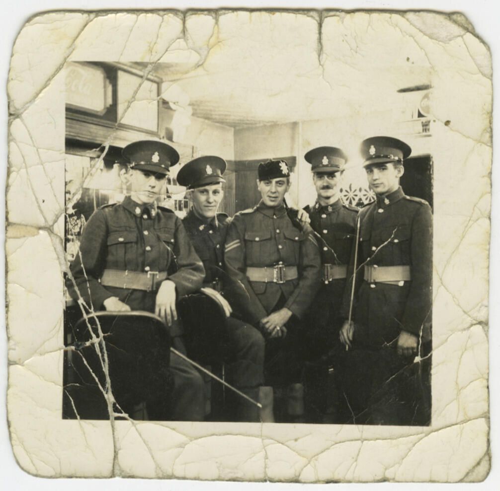An undated photograph of four uniformed RMR soldiers in the company of a Black Watch Corporal, also in uniform. They appear to be standing in a pub.Made/Created