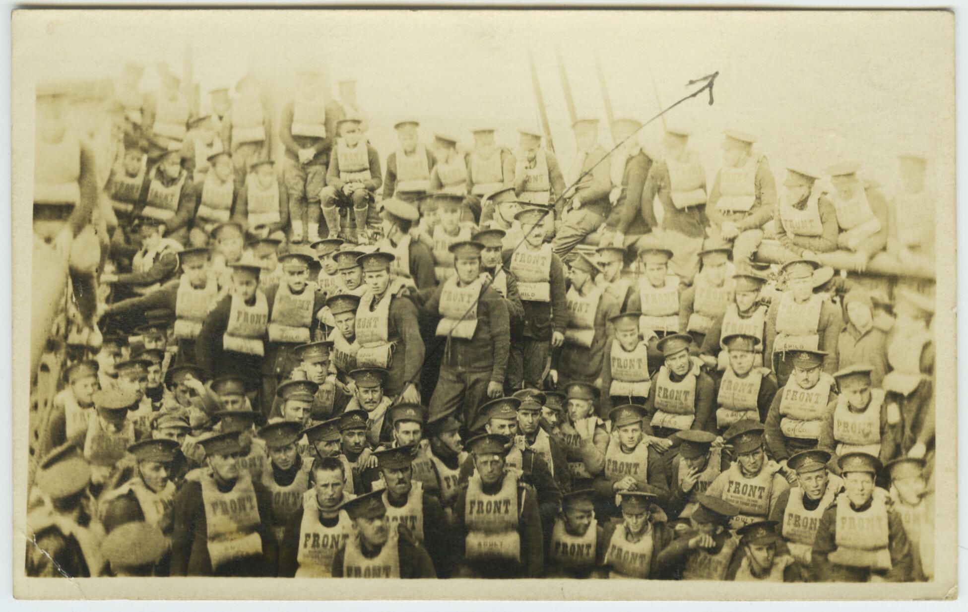 Many soldiers aboard a ship. All of them are wearing caps and Kapok filled life vests which have the word "Front" on them. Kapok is a cotton-like fluff that is no longer used in life jackets as it loses it's buoyancy over time and absorbs water when wet.Photograph Details
