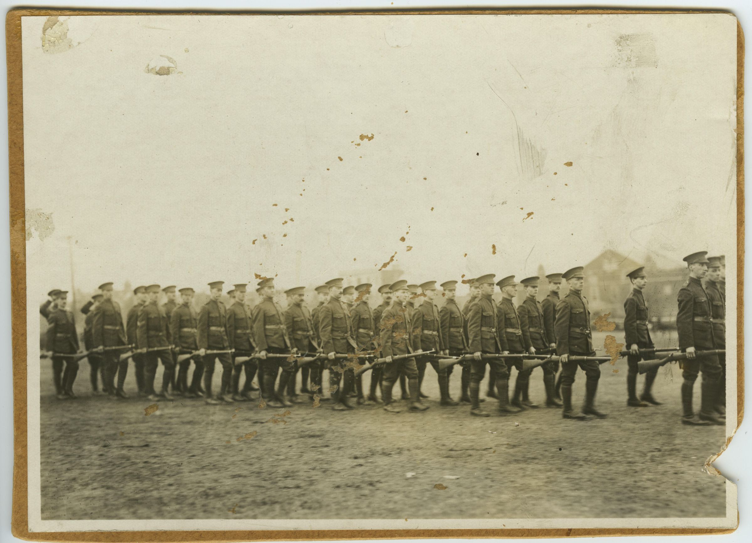 A column of uniformed soldiers is marching past with their rifles "at the trail" during the inspection parade by the Duke of Connaught. In the background is a row of buildingsPhotograph Details