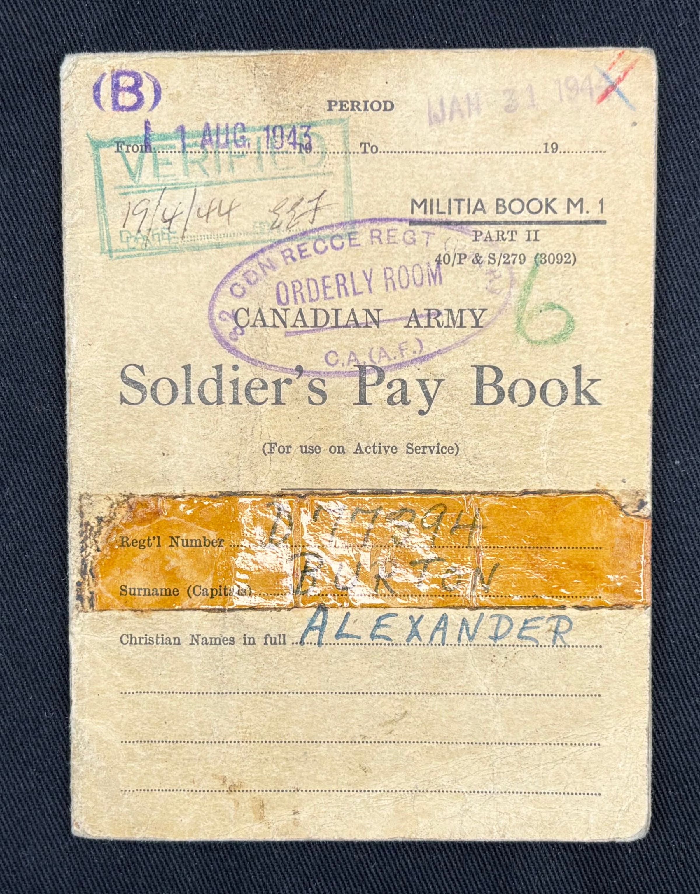 Soldier's pay book, used on active service to keep track of payments and soldier information. This specific pay book belonged to Private Alexander Burton of the RMR.Lexicon