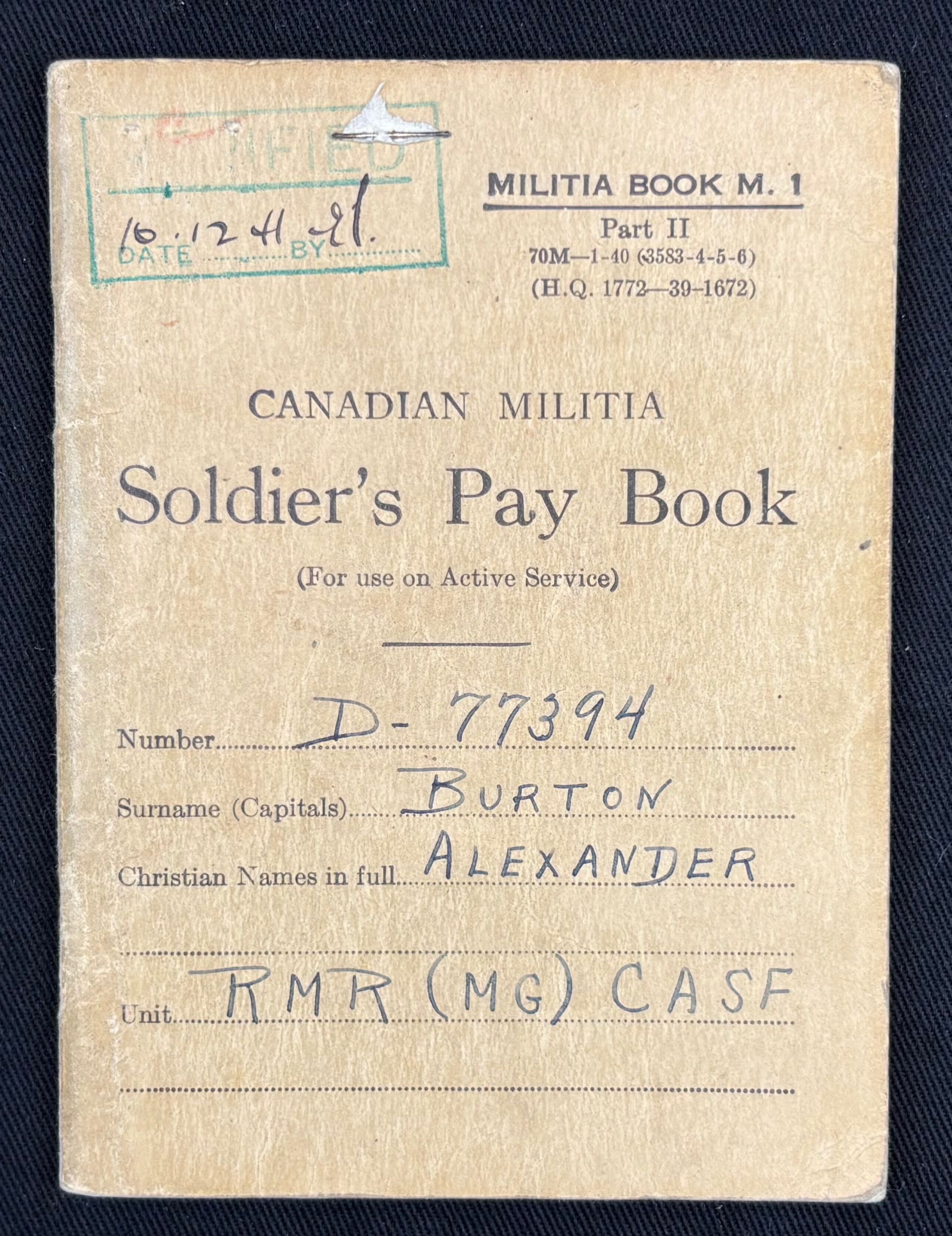 Soldier's pay book, used on active service to keep track of payments and soldier information. This specific pay book belonged to Private Alexander Burton of the RMR.Lexicon