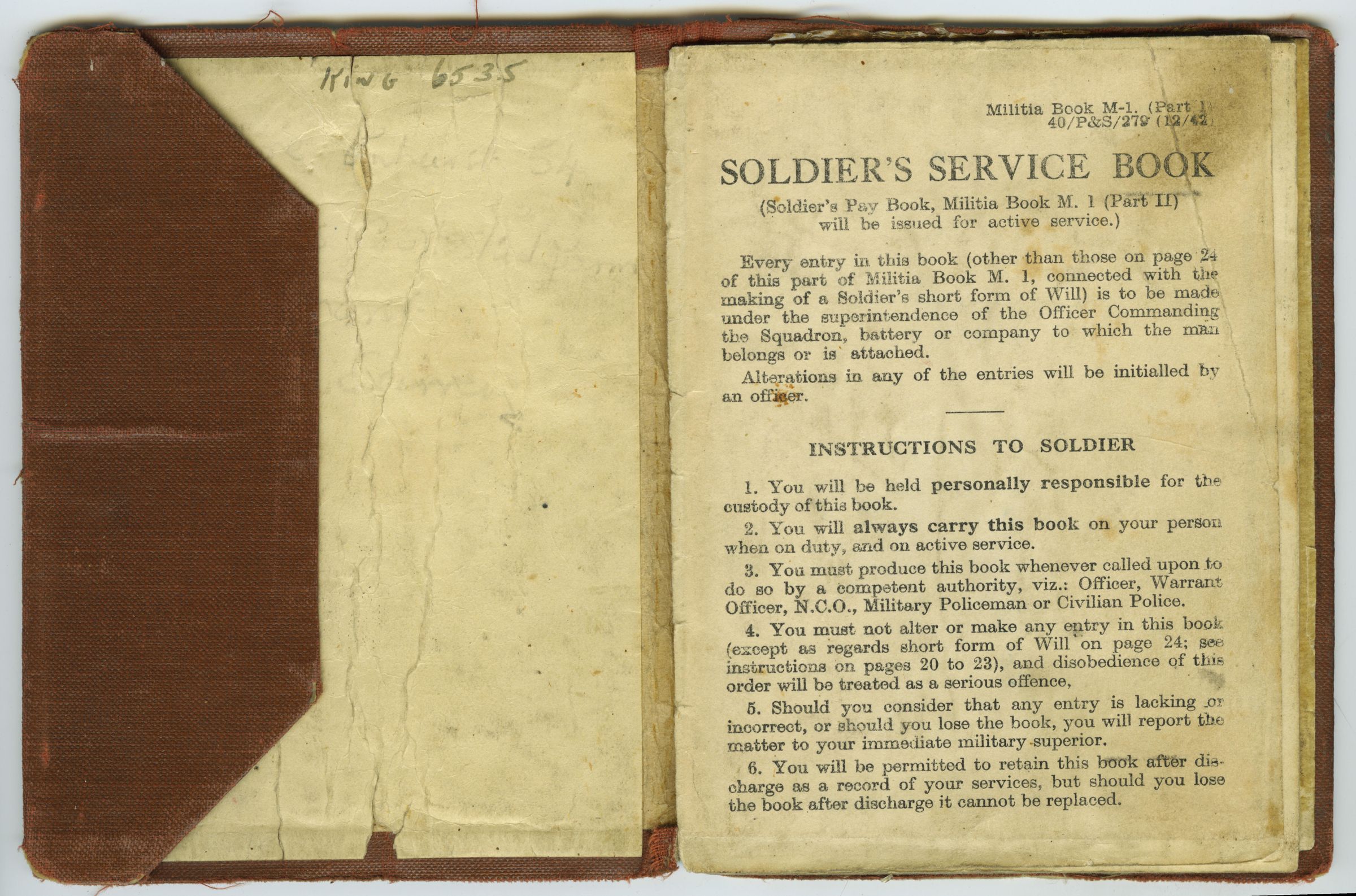 A Soldier's Service Book issued to active force members. The cover is brown and has a flap which wraps around when the book is closed in order to protect the contents.Book Details