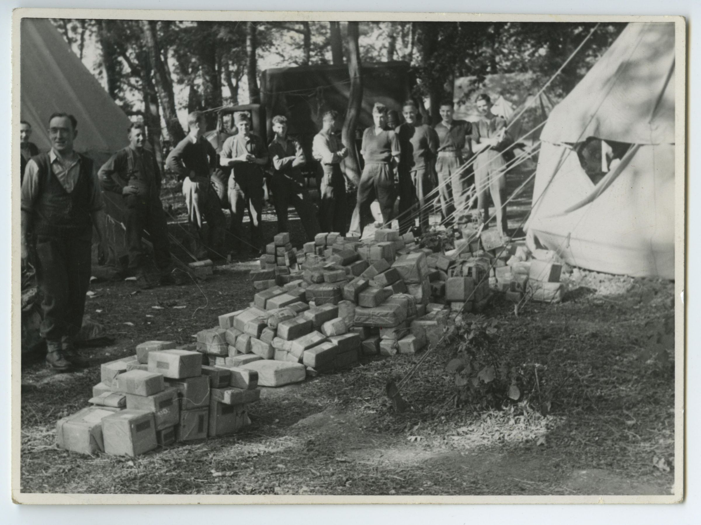 A black and white photo of mail and parcels from the homefront which had been delivered to a regimental bivouac in Epsom, Surrey, England. The first thing to do was to sort things out while the men wait anxiously to receive news from their friends and family.