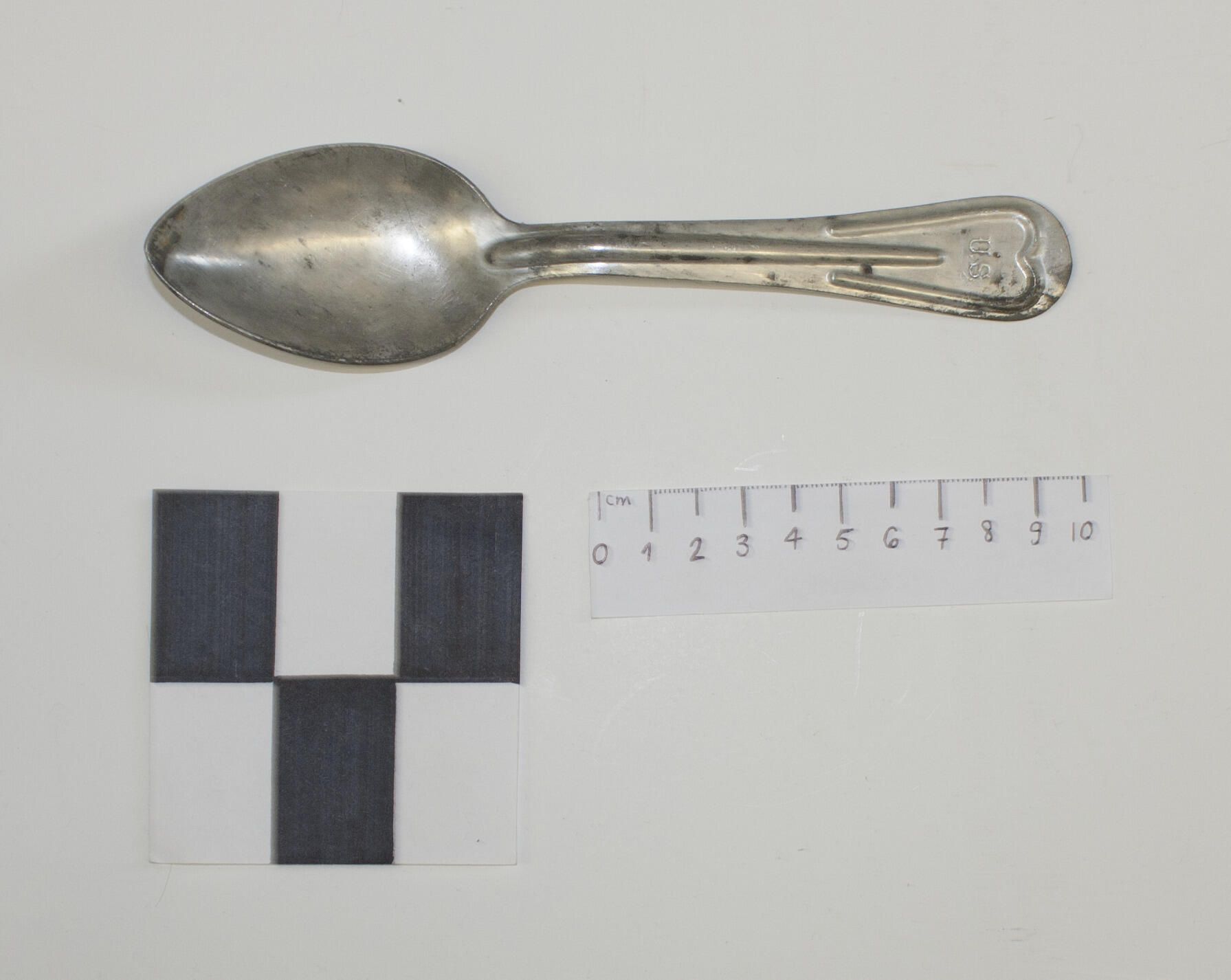 A steel spoon stamped with the letters "U.S" on the handle. It comes from an American army M1910 mess kit.Made/Created
