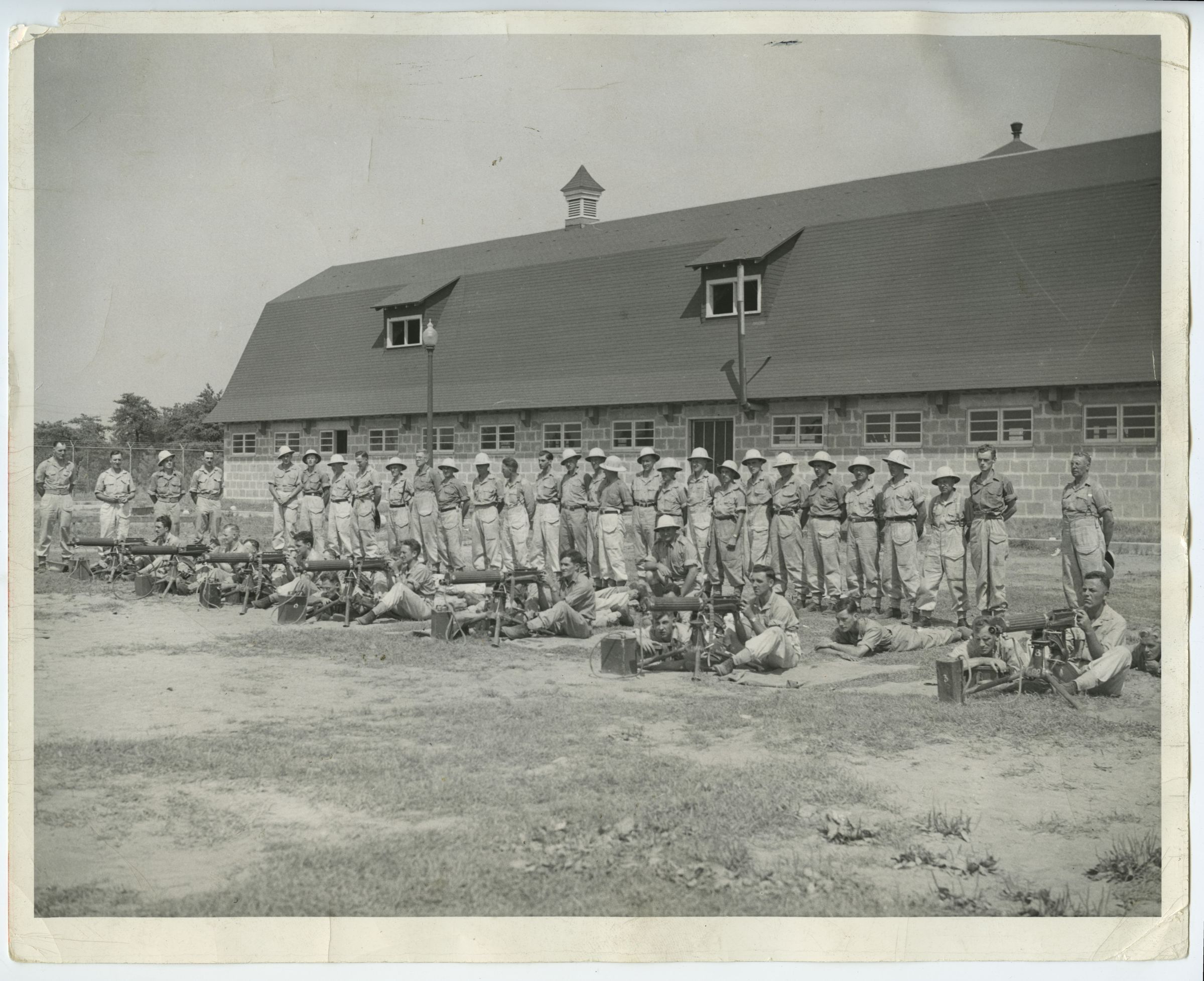 A group of men of the 2nd Bn., RMR, in uniform in front of a barrack at the Three Rivers Training Centre in 1941. The men standing are wearing pith helmets and the men on the ground are behind Vickers machine guns.Photograph Details