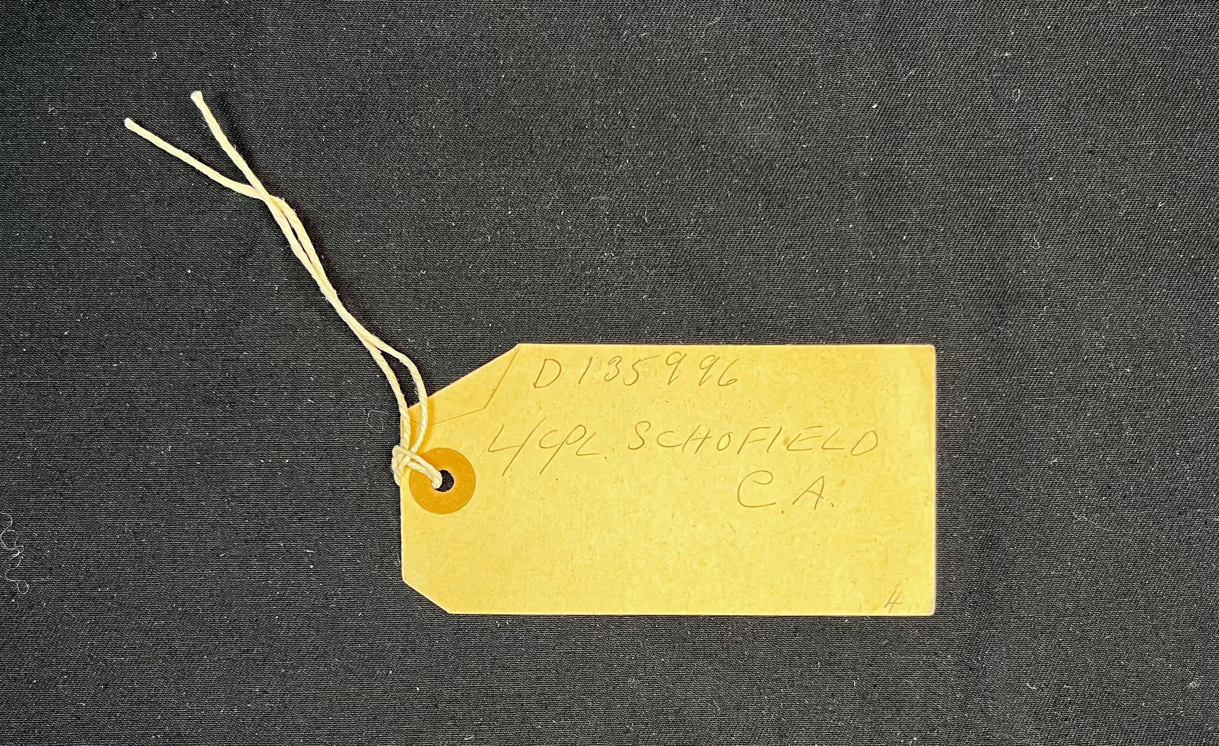 Small brown paper tag with a string attached. The tag reads "D135996 L/CPL SCHOFIELD C.A. 4" on one side, and " 2894 C/I 'C' COY"