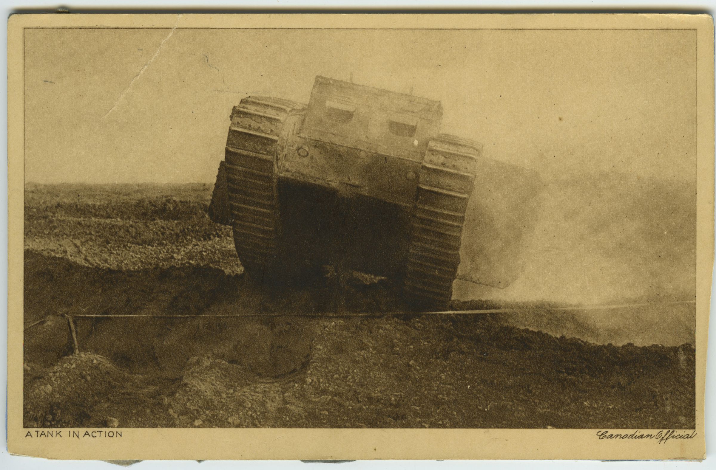An approaching tank is in the centre of the image, it's slightly tipped to the right. A small amount of smoke or dust appears on the right of the tank.Made/Created