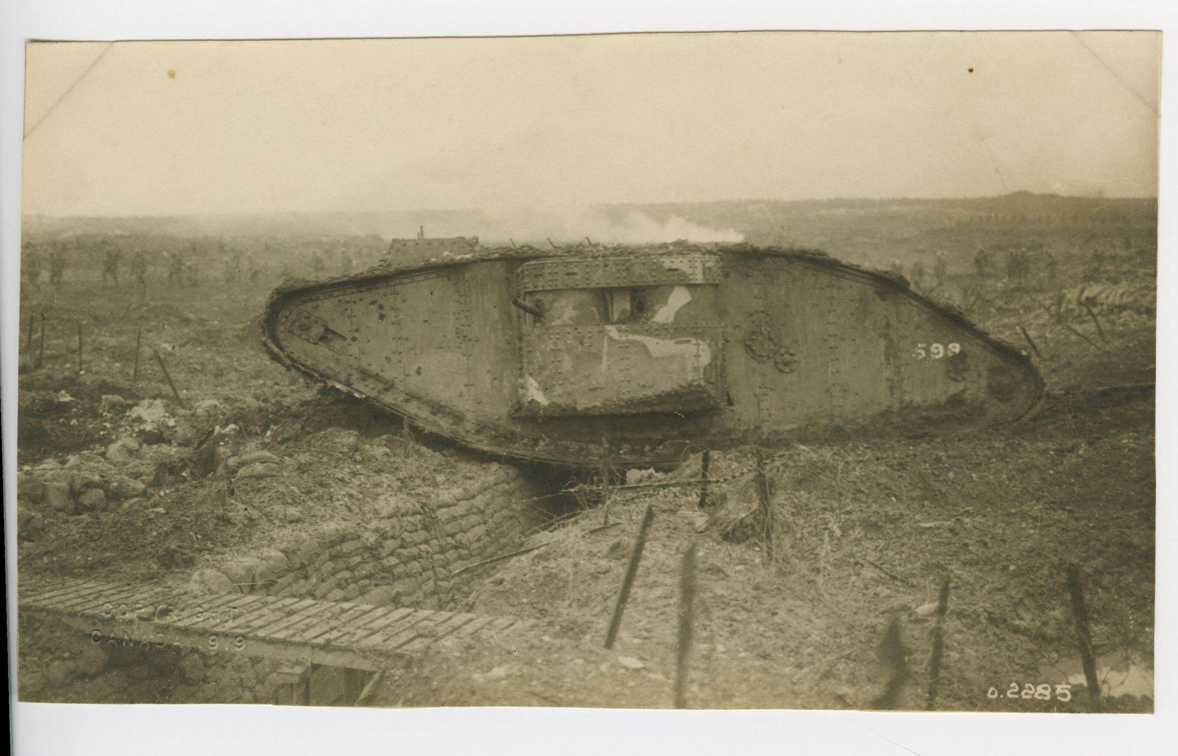 A large British tank crossing a German trench at Vimy Ridge. All eight of the tanks available to the Canadians at Vimy broke down or were knocked out by enemy fire. In the background, in No Man's Land, infantry soldiers are walking in a line.Photograph Details