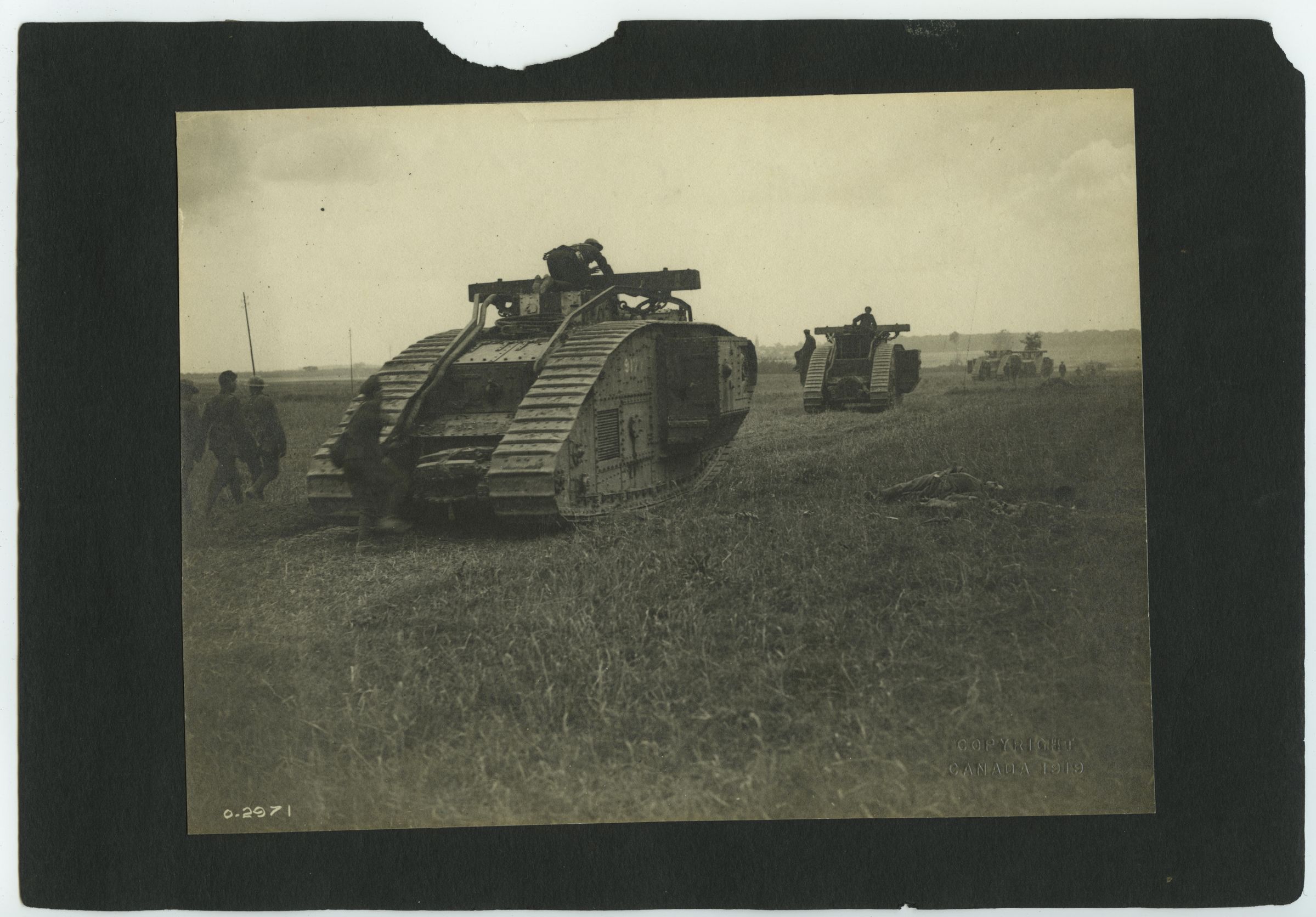 Four British tanks are advancing in a line across an empty field with a few soldiers on foot accompanying them. On the top of two tanks their commanders are silhouetted against the fading light. An unidentified body lies in the grass on the right of the picture. This was at the time of the Battle of Amiens.Photograph Details