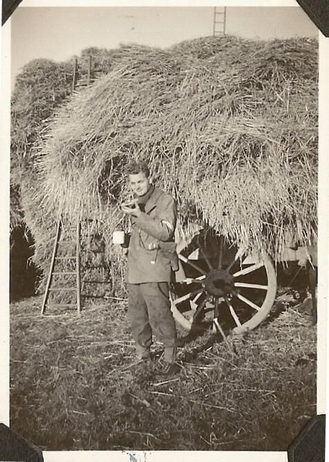 A black and white photo of Private Thomas K. Scovil enjoying a mug of tea and toast. He is wearing a leather jerkin over his battledress uniform while standing in front of several farm-carts piled high with hay.Photograph Details