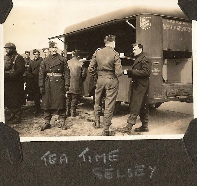 A black and white photo of the Salvation Army mobile canteen stopped to serve tea to members of the RMR stationed in Selsey, England. A slot for sending mail to Canada is located at the rear of the truck. All mail sent to Canada, or coming from Canada, would be opened and reviewed by officers to ensure that no tactical or strategic information would fall into enemy hands.Photograph Details